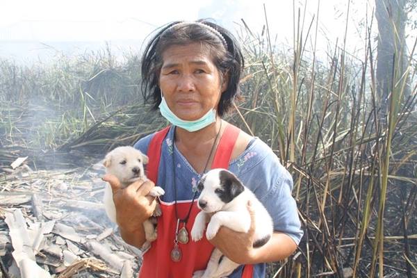 โดยนางติ๋ม ได้เล่าให้ผู้สื่อข่าวฟังว่า ตนได้ขายของอยู่ที่ตลาดแห่งนี้ทุกวัน และในทุกๆวัน ตนจะเห็นสุนัขแม่ลูกอ่อน ออกมาจากป่านั้น และมาหาเศษอาหารเข้าไปในป่าดังกล่าว ตนจึงได้ตามเข้าไปดูก็พบว่า มีลูกสุนัขแรกเกิดอยู่ด้วย ตนเกิดความสงสาร จึงได้คอยหาอาหารเข้าไปให้สุนัขแม่ลูกนั้นเป็นประจำ และในวันนี้ ได้เกิดเพลิงไหม้ป่าดังกล่าว ตนตกใจเพราะเพลิงได้ลามเข้าไปบริเวณที่ลูกสุนัขอยู่ เกิดความเป็นห่วงลูกสุนัขทั้งสองตัวนั้น จึงได้เสี่ยงที่จะเข้าไปช่วยลูกสุนัขออกมาได้ทั้งสองตัว ทั้งที่เพลิงได้ลามมาจนเกือบจะถึงจุด ที่ลูกสุนัขอาศัยอยู่แล้ว