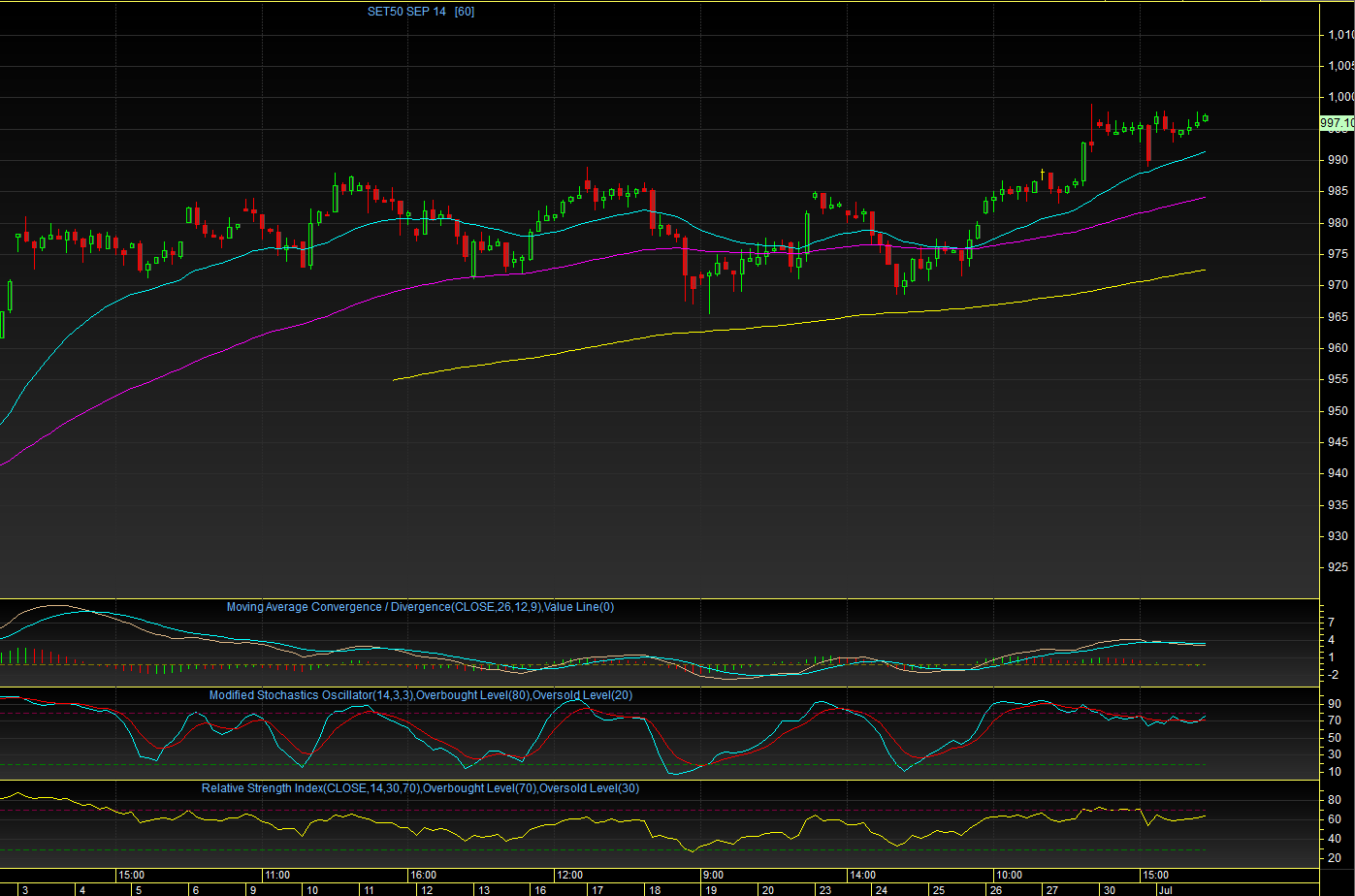 TF60 : เมื่อวานแกว่งตัวในกรอบแคบๆ (992.80 - 997.90) โดยตลอดทั้งวัน มีความพยายามที่จะขึ้นไป ยืนเหนือ 999+ แต่ก็ยังไม่ผ่าน