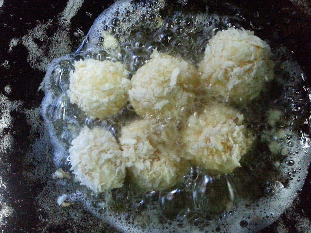 อันนี้คือตอนที่ปั้นเป็นก้อนกลมแล้วชุบไข่ชุบเกล็ดขนมปังแล้ว เตรียมทอดค่า