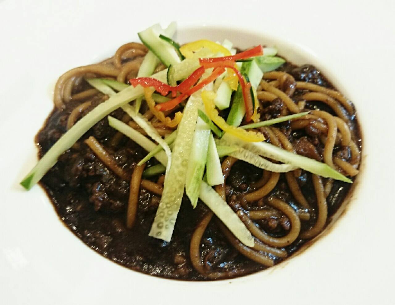 จานแรกเป็น "เส้นสปาเก็ตตี้ราดซอสจาจังเมียน" ออกเค็มๆ หวานนิดๆ มีรสเผ็ดหน่อยๆ ตัดเลี่ยนดี