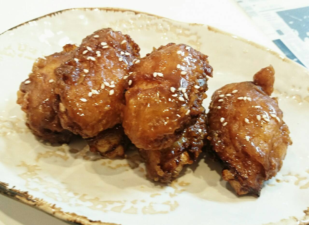 จานสองเป็น "ไก่กรอบราดซอสน้ำผึ้งเลม่อน" ปีกไก่บนชิ้นโตเนื้อแน่นดี