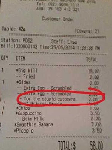 สำนักข่าวต่างประเทศรายงานว่า เกิดเหตุฮือฮา เมื่อหญิงออสเตรเลียรายหนึ่ง ออกโรงโวยร้านกาแฟ Three William ในเมืองเรดเฟิร์น ของออสเตรเลียว่า มีพฤติกรรมก้าวร้าว ปฏิบัติต่อเธออย่างไม่เหมาะสม หลังเกิดเหตุพนักงานรายหนึ่งได้ออกใบเสร็จ พร้อมข้อความด่าว่าเธอว่า "โง่" ขณะที่ร้านได้ออกมาขอโทษ พร้อมเสนอการชดเชยให้