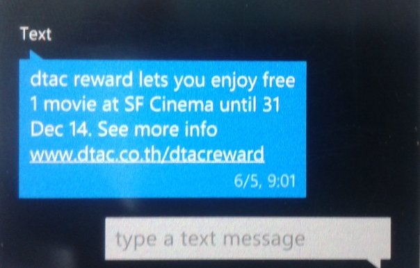 ปีที่แล้วก็มีโปรนี้ และได้ใช้ไปสองรอบ ยังคิดๆอยู่ว่าปีนี้ DTAC จะมีโปรนี้อีก พอได้ sms นี้ก็หาหนังที่จะไปดูทันที