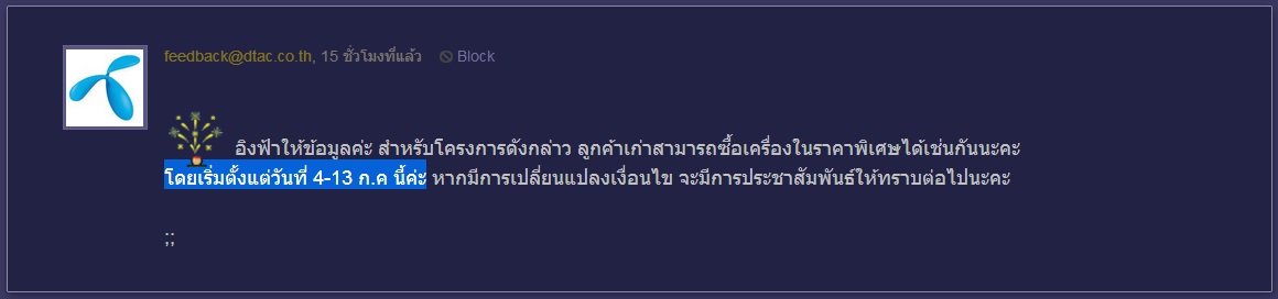 ผมก็เลยถามไปหลังไมค์ว่า โปร.ราคาพิเศษที่ว่านั้น มันมีรายละเอียดว่าอย่างไร อยู่ตรงไหนในเวบไซต์ของ Dtac
