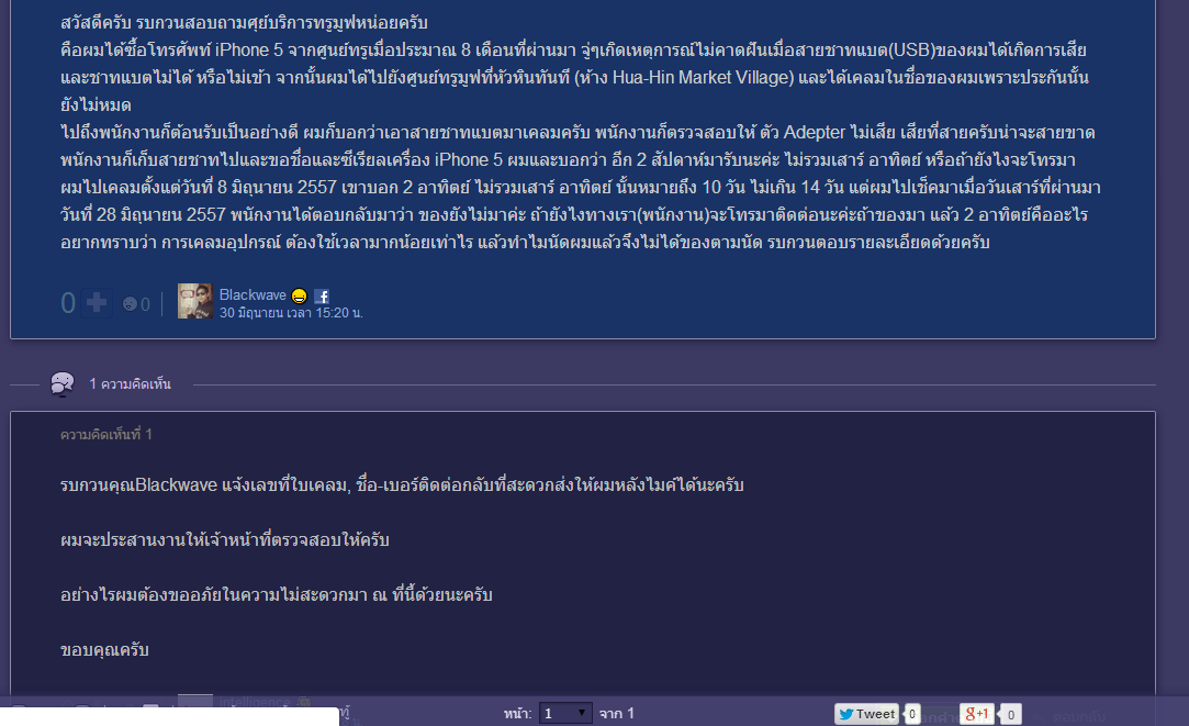 แล้วหลังจากนั้นได้คำตอบกลับมาว่า ' อ้อ ของตกค้างที่ขนส่งค่ะ ' ในกรณีนี้ จะครบรอบ 1 เดือนที่ผมเคลมแล้ว ผมต้องรอ รอ รอไปอีกเมื่อไหร่ครับ แล้วคิดไหมว่าผมจะใช้อะไรชาท วันเสาร์นี้ครบรอบ 1 เดือนที่ผมได้เคลม ตกลงยังไง จะได้เมื่อไหร่ ผมต้องรออีกนานไหม แล้วในกรณีการเคลมแบบนี้ ทำไมไม่มี Standard เลยใช่ไหมครับ ทำไมบางที่มีใบเคลม ทำไมบางที่ไม่มี คือเป็นลูกค้าทรูมูฟมานานนะครับ โทรศัพท์ก็ศูนย์ทรู เสียความรู้สึกดีไหม ถ้าสมมุติผมรอสายชาท ผมมต้องปิดเครื่องรอไปเลยใช่ไหมครับ กว่าจะได้สายชาทมา ขอบคุณครับ