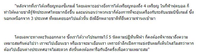 -ผมยอมรับหลายๆอย่างของสมาคมชุดนี้เข้ามาปรับเปลี่ยน โน้น นี่ นั้น ชัดเจน อันนี้ผมชอบมากยุคก่อนไม่เห็นความสำคัญคือวางคิวอุ่นเครื่องตามปฎิทินพิฟ่าเดย์ จุดประกายควา