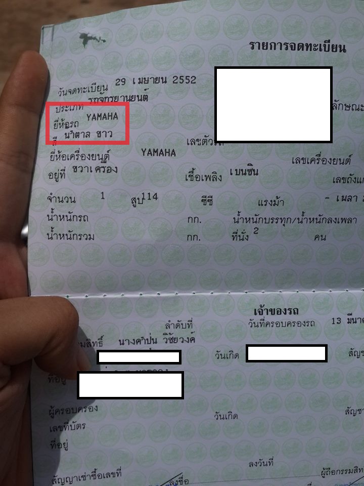ผมได้ไปซื้อรถมอไชค์yamaha fino ทางร้านบอกว่าเป็นรถยึดครับ หมายถึงว่า เขาไม่จ่ายงวดทางร้านเลยไปยึด เท่าที่ดูคือสภาพใหม่ วิ่งไม่กีกี่โล เป็นสี ดำเขีวย ผมเลยตัดสินใจซื้อ จนเวลาผ่านไปผมได้ผ่อนงวดจนหมด จนได้เล่มมา ในเล่มกลับระบุว่า รถของผม เป็นสีน้ำตาล ขาว ไม่ใช่สีดำเขีวย ผมคิดในใจ โดนย้อมแมวขายแล้วกู จนได้ไปสอบถามทางร้าน ทางร้านก็บอกว่า จะเปลี่ยน เล่มให้ใหม่เป็นสีเขีวยดำ (แค่นี้เหรอ) นี้คือการรับผิดชอบทางร้าน
