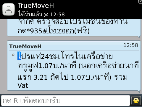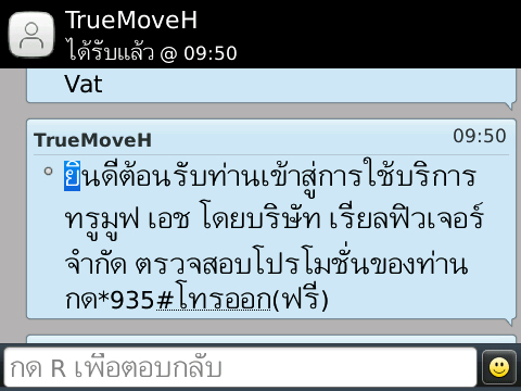 และวันนี้ 05/07/2557 เวลา 09:50น. ได้รับข้อความว่า "ยินดีต้อนรับท่านเข้าสู่การใช้บริการทรูมูฟ เอช โดยบริษัท เรียวฟิวเจอร์ จำกัด ตรวจสอบโปรโมชั่นของท่านกด*935#โทรออก(ฟรี)"