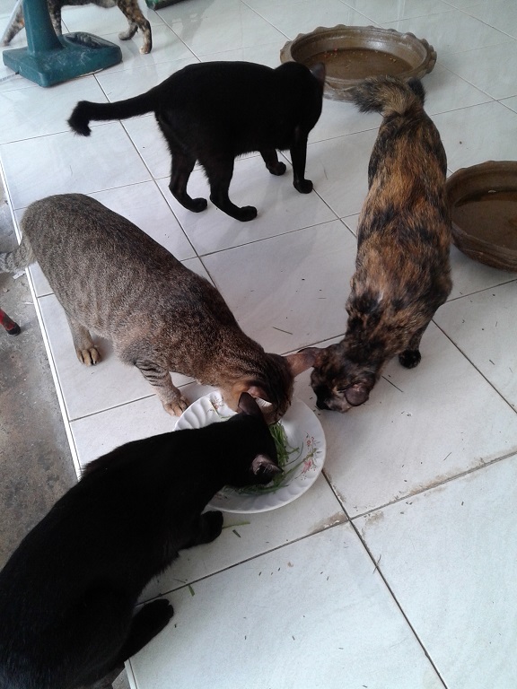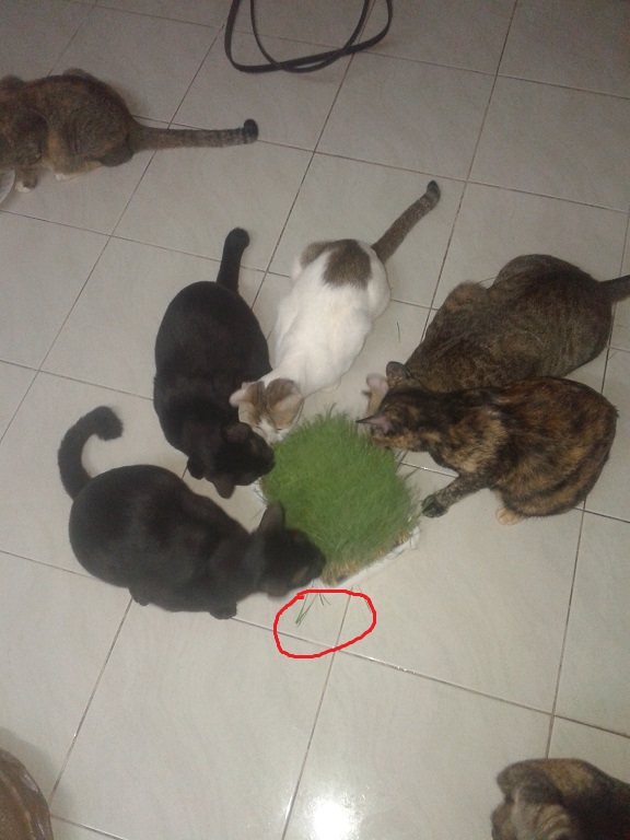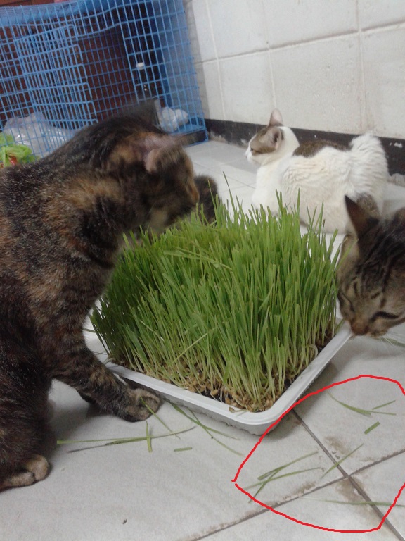 เคยทดลองให้แมวกินแบบทั้ง2แบบในเวลาเดียวกัน ปรากฎว่าแมวมันจะไปรุมกินในถาดกันมากกว่า ที่ตัดใส่ในจานมันไม่สนใจกันเลยทั้งๆที่ตัดให้สดๆเหมือนกัน แต่ว่าปัญหาก็คือถ้ายกให้กินทั้งถาดบางครั้งก็ใช้ปากถอนหรือดึงออกมาทั้งต้นแล้วก็ไม่กิน(ในวงสีแดง) ทำให้เสียของ แต่ถ้ามีทางเลือกใส่จานเพียงอย่างเดียวแมวก็เข้ามากินนะแต่ว่ากินกันไม่หมด