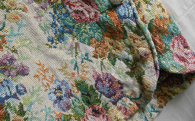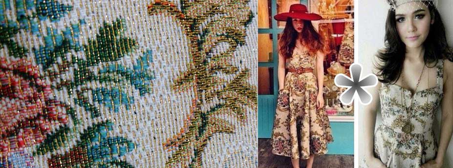 new cop P's material เดรสลายดอกผ้าวิ้งทอง งานสวย อก 32-33 เอว 26-27 สะโพกฟรี ยาว 40 นิ้ว