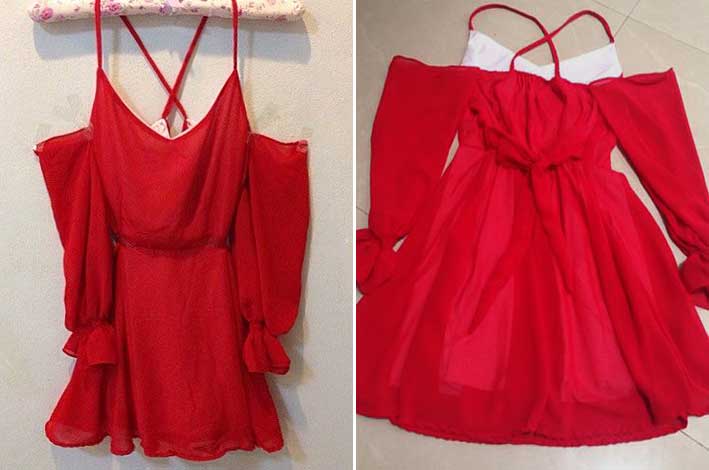เดรสสีแดง ก๊อปแบรนด์ อก 34 เอว 26-30 สะโพกฟรี ยาว 30 นิ้ว