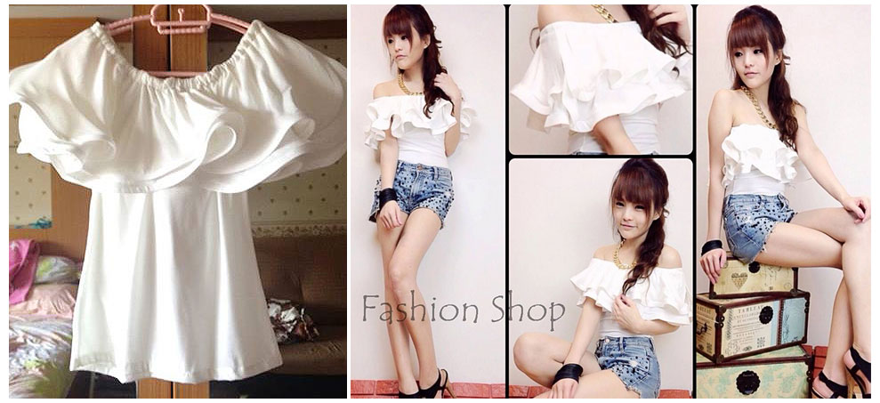 new เสื้อสีขาวปาดไหล่ ระบายลอนเด้งๆ งานสวยนะคะ (ไม่ใช่แบบลอนอ่อนๆ) อกได้ถึง 36 ยาว 19 นิ้ว