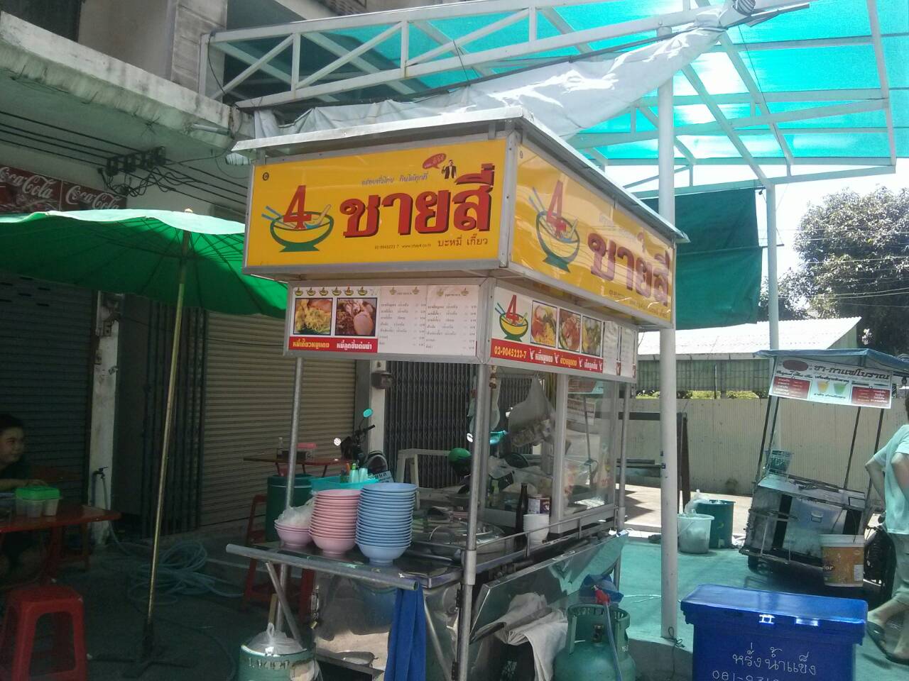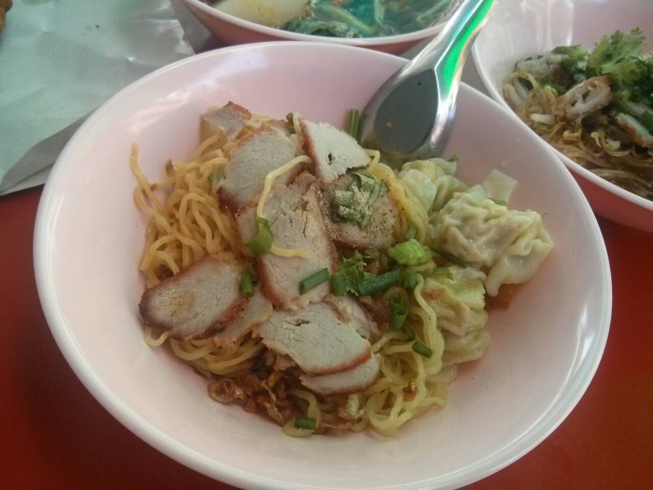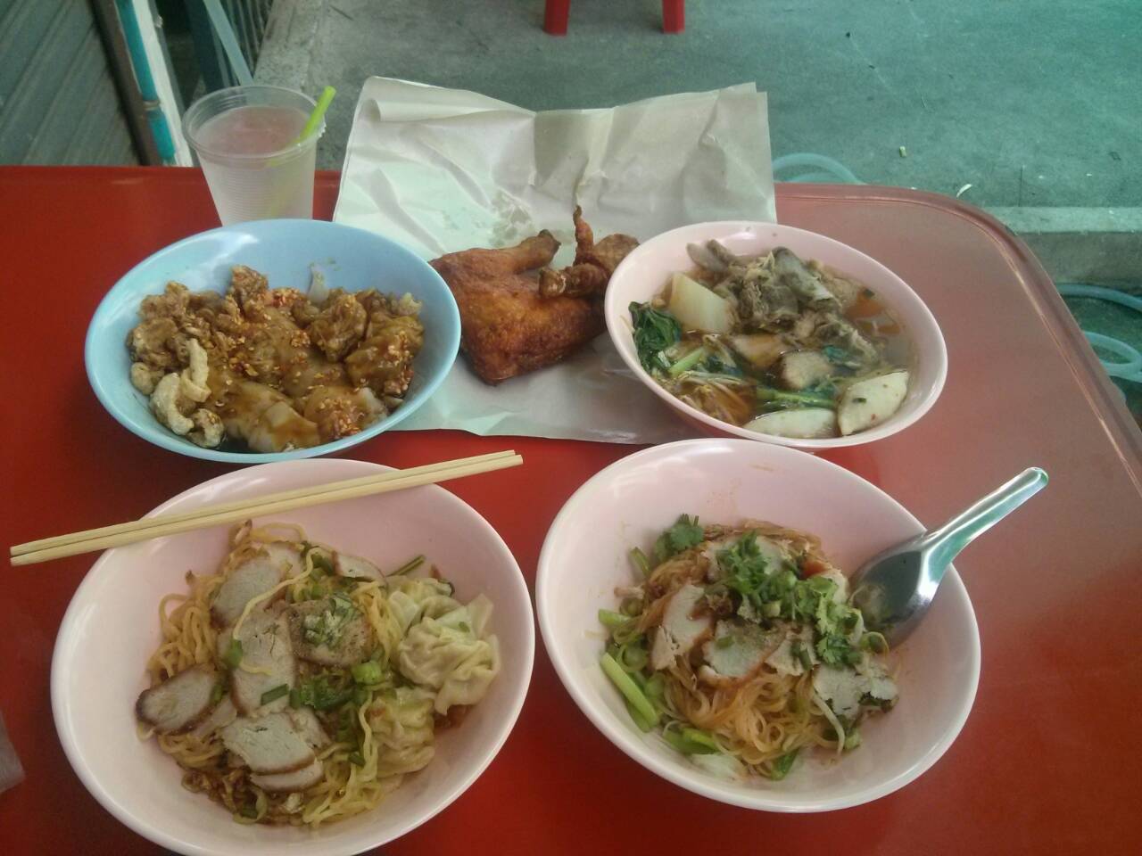 ว่าจะเดินไปกินก๋วยเตี๋ยวแซงโค้งเจ้าประจำ เดินผ่ายชายสี่ เอ๊ะวันนี้เพิ่งมาหลังจากหยุดขายไปนาน 2 สัปดาห์ได้มั้งนึกว่าหนีหนี้เลิกขายไปแล้ว(ระหว่างกินอยู่ก็มีคนเดินผ่านมาทักตลอดว่านึกว่าเลิกขายแล้ว เจ้าของร้านล้มขาเจ็บมาขายไม่ได้) เดินเลยร้านมาเจอร้านไก่ทอดเลยตัดสินใจกินไก่ทอดแกล้มบะหมี่ชายสี่นี่แหละ เดี๋ยวเลิกขายจริงจะไม่ได้ลองกินร้านนี้ ก็ซื้อน่องไก่กะตะโพกมา สั่งบะหมี่เกี๊ยวแห้งพิเศษ เล็กแห้งพิเศษ และเกาเหลา ระหว่างรอเหลือบไปเห็นมอ'ไซด์ขายก๋วยเตี๋ยวหลอดขนมจีบ เลยยืมถ้วยก๋วยเดี๋ยวแม่ค้าไปซื้อมาเป็นเครื่องแกล้มอีกอย่าง ไปยืนเถึยงกับคนขายว่าพริกน้ำส้มมันมีแต่เม็ดพริกคนขายบอกว่าไม่เผ็ด ถ้าเป็นเปลือกพริดสีแดงๆถึงจะเผ็ด ไอ้เราก็เลยต้องยกวิชาการมาอ้างว่าเม็ดพริกมีสารทำให้ระคายเคืองถึงเผ็ด กว่าจะให้เข้าใจได้ แดดเผาห้ว เหงื่อท่วมต้วเลย