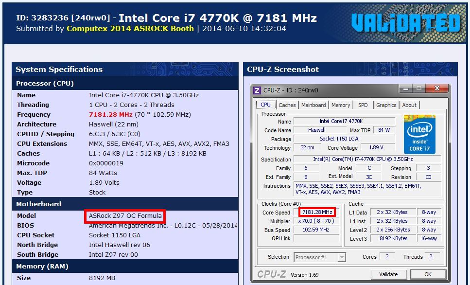 ไทเป, ไต้หวัน, 11 มิถุนายน 2014  ASRock Inc., ผู้ผลิตเมนบอร์ดชั้นนำของโลก ทุบสถิติโลกใหม่ ด้วยเมนบอร์ดเรือธงรุ่นล่าส่าสุด  ASRock Z97 OC Formula ซึ่งมีนักโอเวอร์คล็อกระดับมืออาชีพ John Lam จากทาง HKEPC OC ที่สามารถดันความเร็วของซีพียู Intel® Core™ i7-4770K ให้ไปอยู่ที่ 7181.23 MHz ขึ้นแท่นอันดับหนึ่งของโลกที่ HWBOT.org!