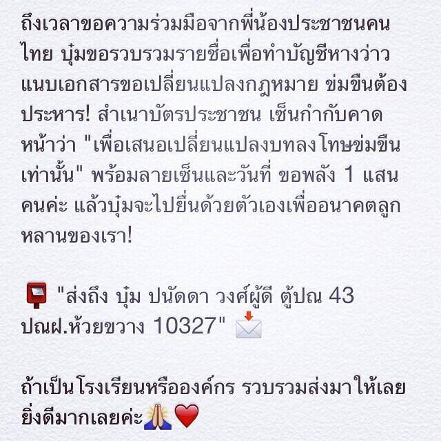 ปล. ความคิดของเรา ที่เราอยากส่งรายชื่อให้คุณบุ๋มในครั้งนี้ ก็เพื่ออย่างน้อยเหตุการณ์นี้ มันจะได้ไปกระตุ้นให้ ใครบางคน ที่มีอำนาจในการกระทำ หรือเปลียนแปลงกฏหมายให้มันน่ากลัวและน่าเกรงขามกว่านี้ ได้ลงมือทำอะไร สักอย่างที่มันเห็นสมควร กับสิ่งที่มันทำ และจะได้ไม่เปลืองพื้นที่คุก เปลืองงบหลวง