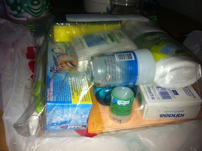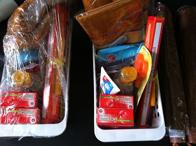 ตระกร้า ,สบู่ 2 ก้อน ,แปรงสีฟัน,ยาสีฟัน ,โคโดโมะสูตรอ่อน,ธูปเทียนเล็ก,ฟองน้ำใยขัดสีฟ้า,ผ้าขนหนูเล็ก,ผ้าขนหนูกลาง,