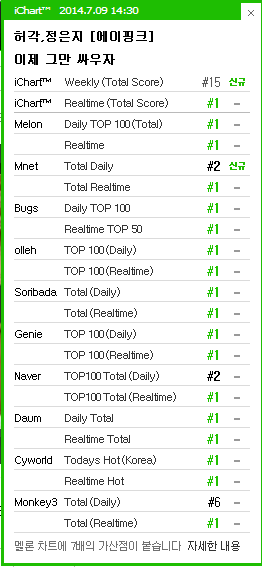 รวมชาร์ตเพลง 5 ชาร์ตหลัก ประจำวันที่ 11/07/2014 อิงจาก 5 ชาร์ตหลักของเกาหลี ได้แก่ Melon Mnet Bugs Olleh และ Soribada สำหรับการ All Kill ในความหมายของการรายงานชาร์ตนี้คือ ขึ้นที่ 1 ชาร์ตเพลงประจำวัน