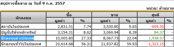 สรุปการซื้อขาย ณ วันที่ 9 ก.ค. 2557