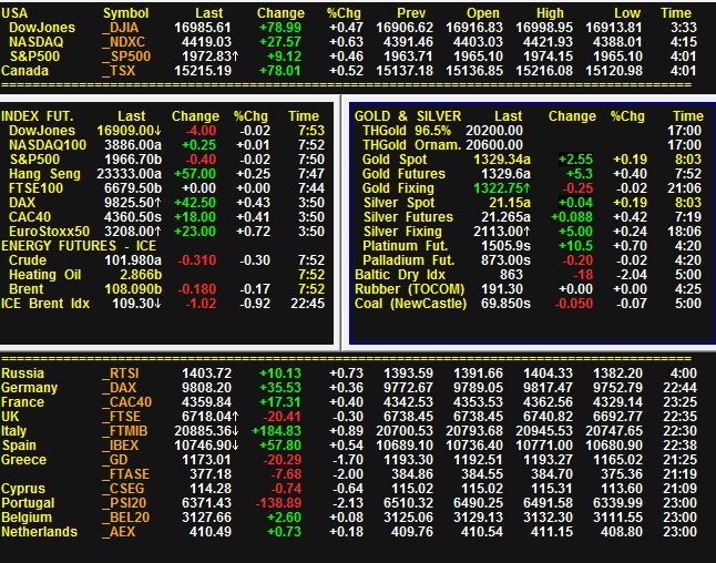 ดาวโจนส์ เพิ่มขึ้น 78.99 จุด (0.47 เปอร์เซ็นต์) ปิดที่ 16,985.61 จุด เอสแอนด์พี เพิ่มขึ้น 9.12 จุด (0.46 เปอร์เซ็นต์) ปิดที่ 1,972.83 จุด แนสแดค เพิ่มขึ้น 27.57 จุด (0.63 เปอร์เซ็นต์) ปิดที่ 4,419.03 จุด