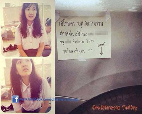 สาวนักศึกษา ขับรถถอยชนรถอีกคัน รอเจ้าของไม่เจอ เลยเขียนป้ายและเบอร์ติดต่อ ติดไว้ข้างรถ..!!