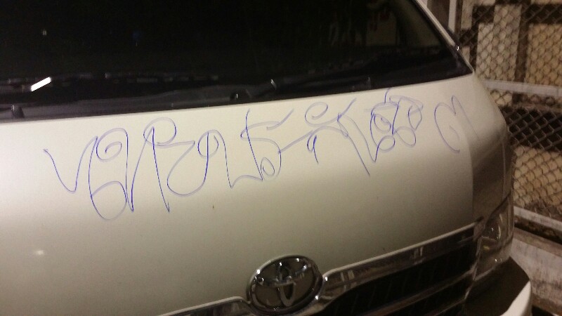 อยู่ม่เด็กอายุประมาณ 10-14 เพศชาย ผมเกรียนสกินเฮด รูปร่างอวบๆ เดินมาหน้าเหมือนจะเดินข้ามถนน แต่กลับมาหยุดที่หน้ารถแล้วเขียนๆที่หน้ารถ ตอนแรกผมนึกว่าพวกเด็กเช็ดกระจกรถ