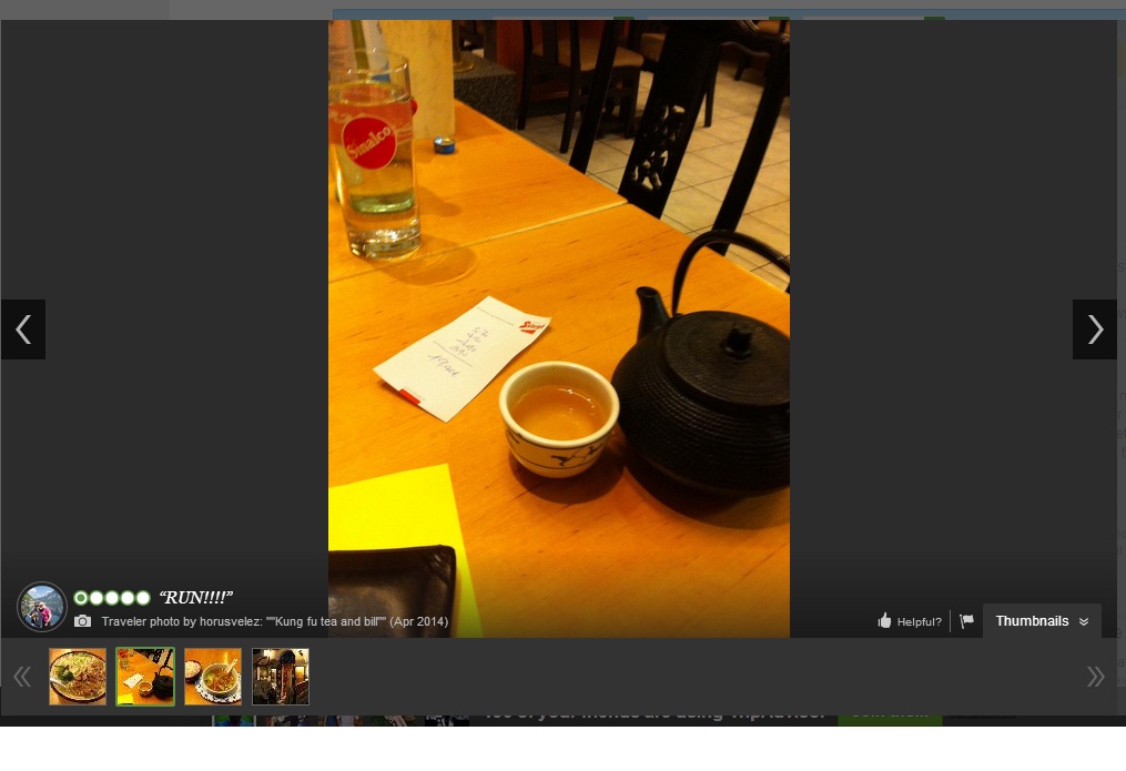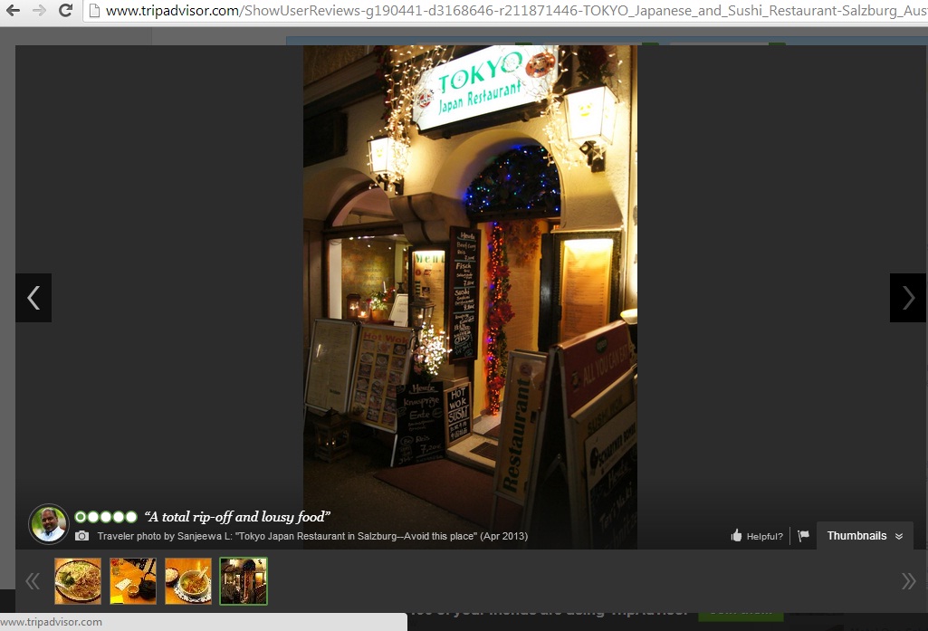 พอแฟนเราเข้าเวปไปหาร้านนี้ ปรากฎว่ามีคน review ไว้แล้ว 60 กว่าคน ซึ่งแบบว่าทุกคนเจอแบบที่เรากับแฟนเจอเลย คือเเสียใจที่ไม่ได้มาอ่านรีวิวใน tripadvisor ก่อนไปเข้าร้านนี้ บางคนใช้นิยามร้านนี้เลยว่าคือ "Tourist's trap for ppl who are looking for Asian food in salzburg" (กับดักของนักท่องเที่ยวที่แสวงหาอาหารเอเชียใน salzburg) ทุกคนคือเข้าร้านนี้เพราะเห็นภาพจาก billboard อาหารที่โชว์ด้านล่าง แต่พอขึ้นไป พนง. ก้อจะอ้างเหตุผลต่างๆนาๆว่าเบ็นโตะขายเฉพาะช่วงนั้นช่วงนี้ของวัน ตอนนี้หมดเวลาขายแล้ว แล้วก้อเชิญชวนให้สั่งเมนูใหญ่สุดของร้าน ซึ่งฝรั่งบางคนที่แบบว่ามีเงินหรือไม่ก็มาจากประเทศที่อาหารญี่ปุ่นแพงก็หลวมตัวสั่งไป แต่สิ่งที่เค้าเขียนในรีวิวนี่คือแย่ของแย่ที่สุด เช่น บอกว่าซุปมิโสะคือมาเหมือนซุปผักรวม แล้วมีกลิ่นเครือ่งเทศอินเดียด้วย แล้วพอถึงตอนเช็คบิล ออกมาปรากฎว่าราคาในเมนูตอนสั่งประมาณ 50 Euro แต่พอเก็บตังค์ออกมาคือ 80กว่า Euro เป็นต้น มีอีกคนมารีวิวว่าเข้าไปนั่งแล้วพนักงานมากดดันให้สั่งน้ำเลยสั่งน้ำก๊อกไป แต่พอดูเมนูแล้วรู้สึกว่าไม่ใช่แบบที่เห็นด้านล่าง เลยตัดสินใจจะเดินออก แต่พนง.ชายก้อมาเสริฟน้ำเปล่าพอดี (แก้วใส่น้ำเปล่า 2 ใบ) เค้าก้อเลยบอกว่าไม่ทานแล้ว จะกลับล่ะ พนง.ก้อบอกว่าต้องจ่ายค่าน้ำมาก่อนคนละ 3.50 euro พอฝรั่งคนนี้บอกว่าแพงเกินไป ยังไม่ได้กินเลย จะไม่จ่าย ก้อเกิดการโต้เถียงกันรุนแรง เค้าเขียนไว้ว่าพนักงานชายนี่ aggressive มากและเกือบมีการลงไม้ลงมือกันด้วย