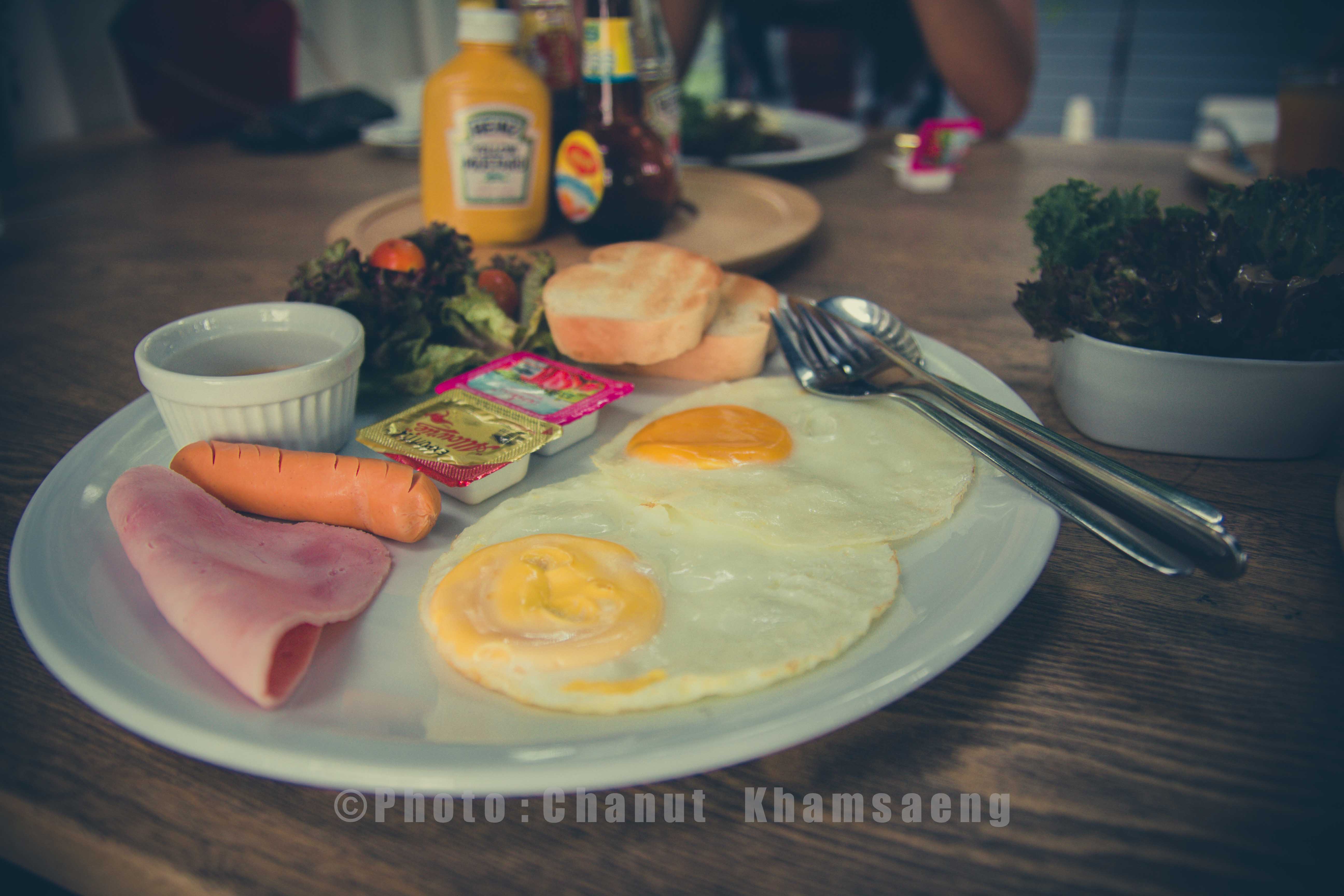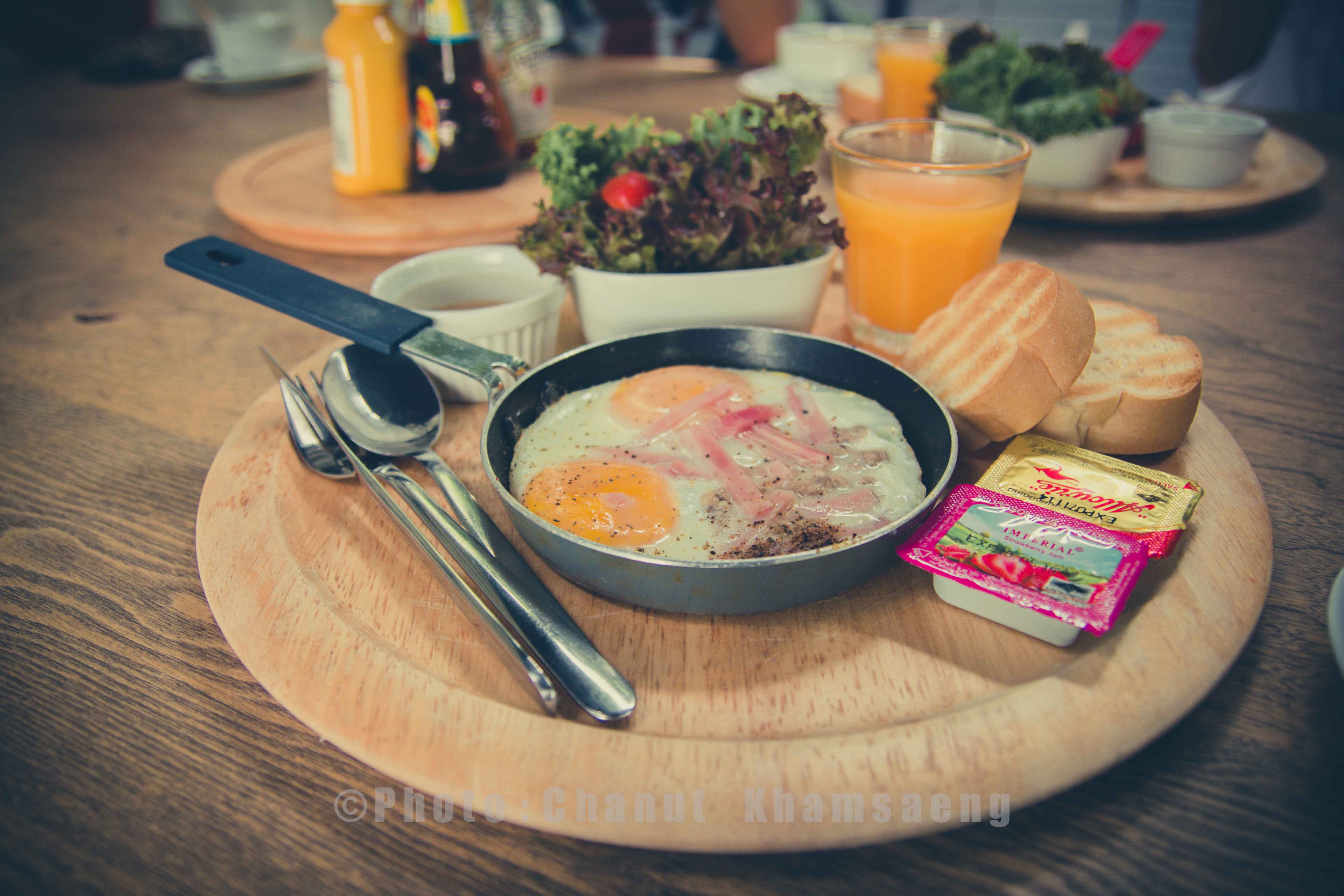 "ไข่กระทะ เสริฟพร้อม สลัดและน้ำส้ม"