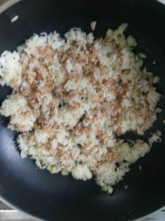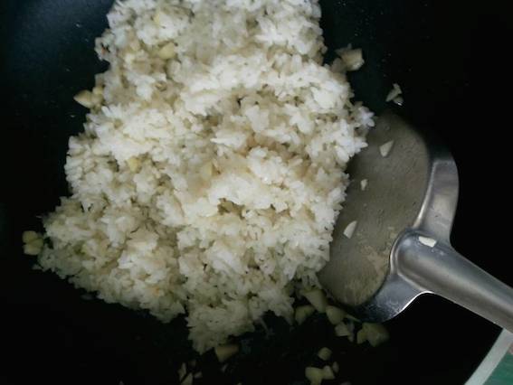 พอกระเทียมเริ่มออกเหลืองๆก็นำข้าวมาใส่แล้วคลุกกระเทียมสักพักค่ะ