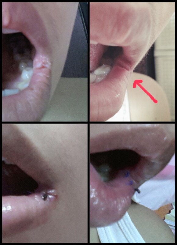 (ที่ปากฉีก เราสันนิษฐานว่าเกิดจากการอ้าปากนานถึง 2 ชม. บวกกับความไม่ระวังของ นศ.แพทย์ ที่ทำให้ปากเราโดนเครื่องมือแพทย์ซ้ำ ๆ ที่เดิมนาน ๆ )