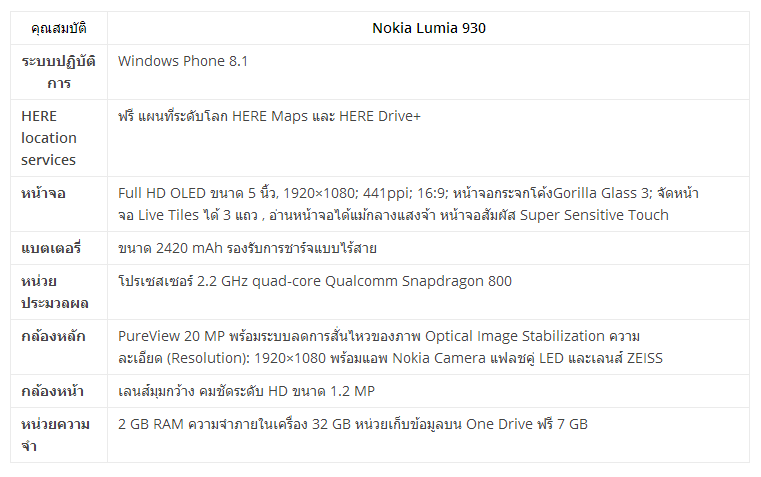 Specification Nokia Lumia 930 (ส่วนสเปคพื้นฐาน)