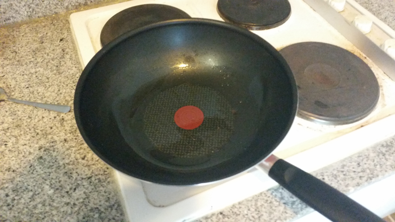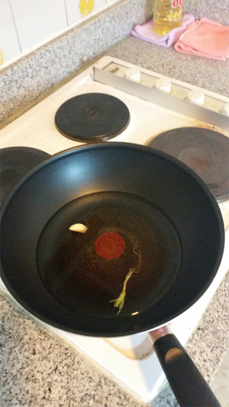 ตั้งกระทะใส่น้ำมันเล็กน้อย ผมใช้กระทะต่อจากที่ทำเกี๊ยวน้ำเลยครับ ไม่ได้ล้าง แหะๆ