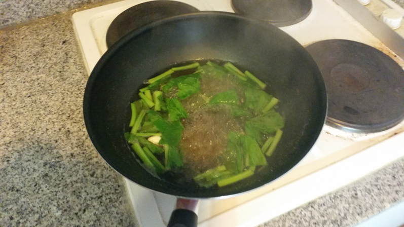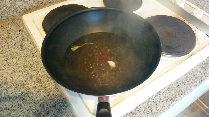 ตั้งกระทะใส่น้ำ ใส่รากผักชีกับกระเทียมลงไป ถ้ามีพริกไทยเม็ดก็บุบๆแล้วใส่ไปด้วย รอจนน้ำซุปเดือด