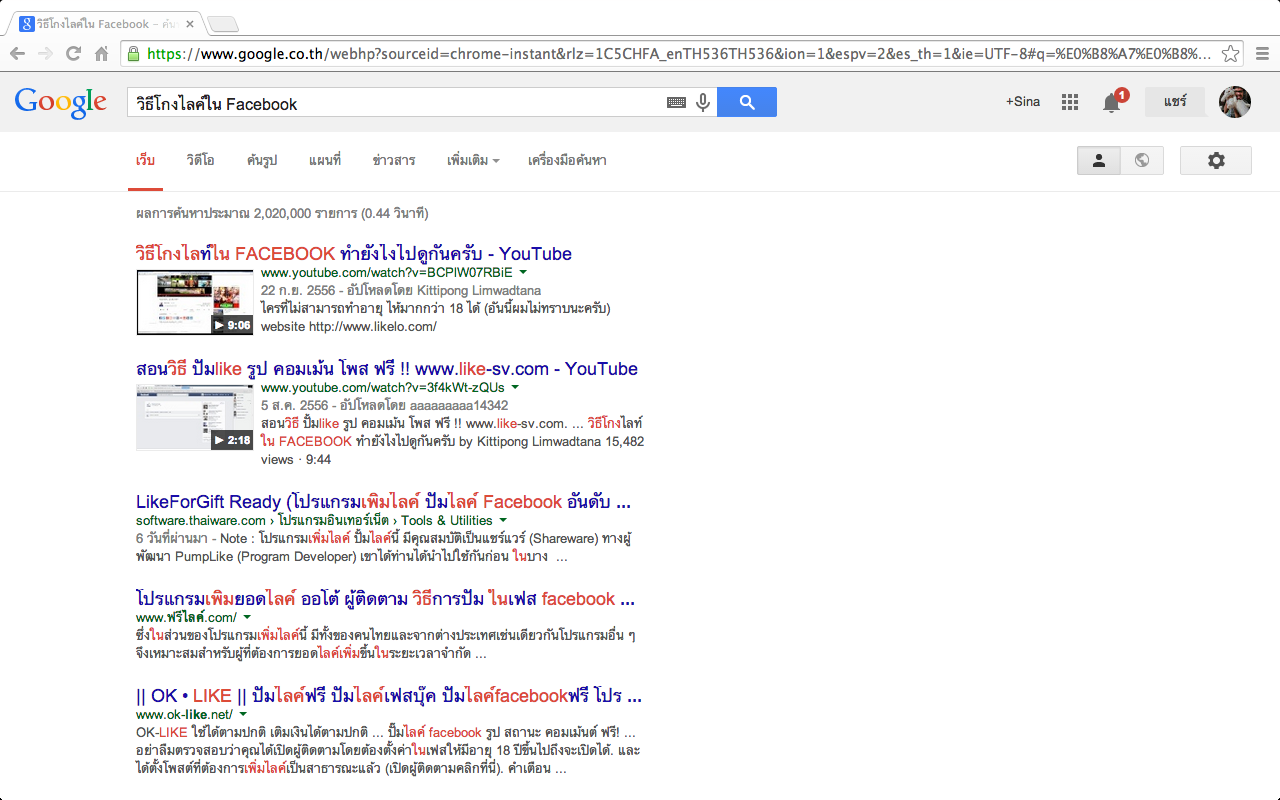 ผมเลยลองกดเซิร์ชดูใน Google ถึงวิธีการโกงไลค์ ผลที่ได้จากการค้นคือ