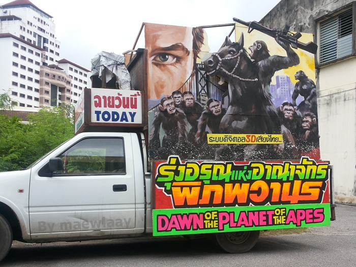 “ป้ายโฆษณาหนังเขียนมือ” (Cut-out) ติดตั้งบนรถยนต์กระบะแห่รอบเมืองภูเก็ต ซึ่งเป็นวิธีเรียกลูกค้าตั้งแต่ก่อนยุคอนาล็อกด้วยซ้ำ แต่ก็ยังมีให้เห็นกันในยุคดิจิตอลแบบนี้ ที่คนสามารถรับข้อมูลหนัง และจองตั๋วผ่านสมาร์ทโฟน