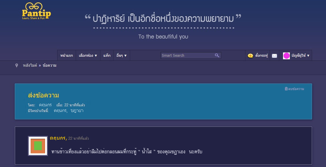 ถึงแม้จะจั๊กจี้ทุกครั้งที่เห็นข้อความจากล็อกอินนาย"ตฤนกร" แต่พอเปิดเว็ปพันทิปเห็นมีแจ้งหลังไมค์ทีไร ผมอดไม่ได้สักทีที่จะต้องตามเข้าไปดู แล้วคำทักทายชวนจั๊กจี้จั๊กเดียมแบบนี้ก็จะมีมาให้ถอนหายใจทุกทีเช่นกัน