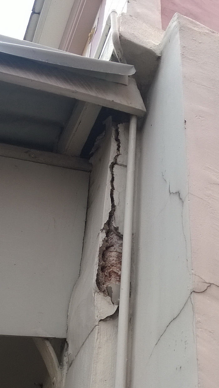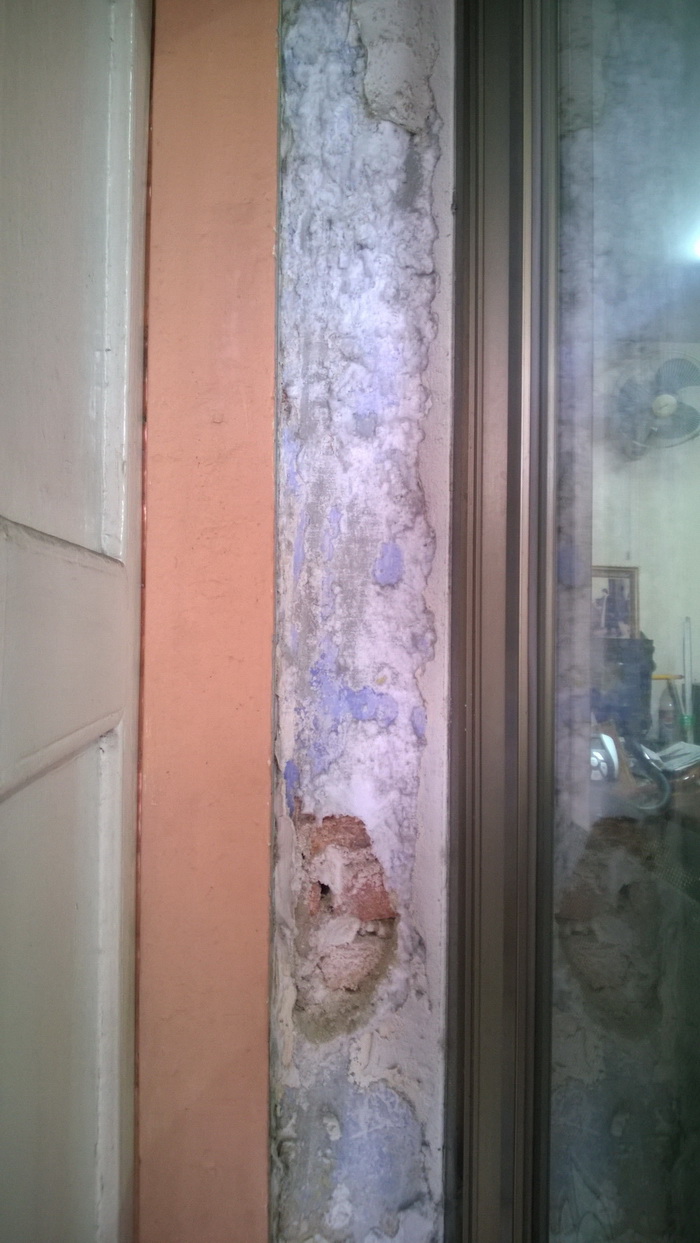 เสากับผนังบ้านแตก (บางส่วนเป็นขุย) ไม่รู้จะซ่อมยังไงเคยจ้างช่างมาโบกปูนและทาสีแต่ก็ยังเป็นอยู่