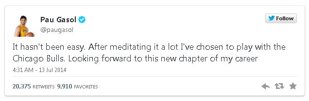 Pau Gasol announces via Twitter that he is signing with the Chicago Bulls.