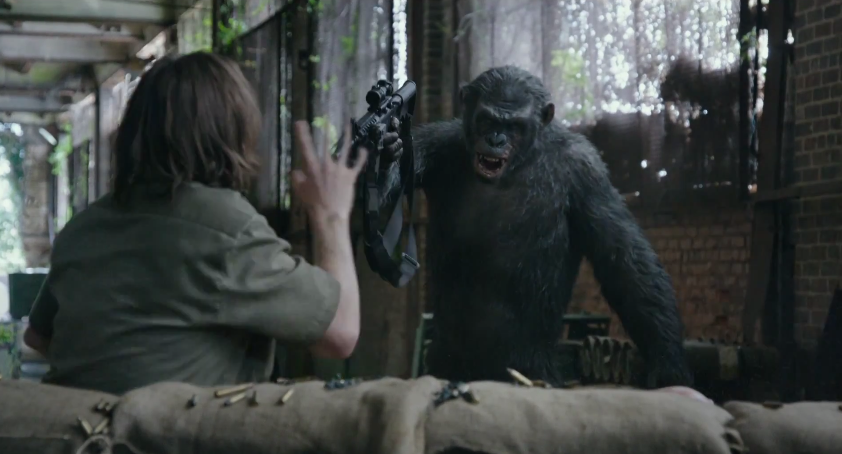 แต่ทว่าในความมืดมนทั้งหนังและตัวโรงหนังเอง ความซวยก็บังเกิดขึ้นเมื่อผมกับเพื่อนผมได้ยินเสียงเด็กมาจากฝั่งด้านหน้าโรง OMFG! นี่พ่อแม่เขาคิดยังไงพาเด็กมาดูหนังเรื่องนี้ว่ะ หนังลิงถือปืนนะเว้ยไม่ใช่สารคดืสัตว์โลก! และนั่นแหละความซวยเพราะพอถึงฉากในรูปนี่แหละ (อันนี้ไม่ถือว่าสปอยล์นะเพราะมีในตัวอย่าง) แรกๆเด็กก็ขำแตกเลย พอลั่นไกเท่านั่นแหละ เด็กถึงกับร้องไห้งอแงเลย! ฟ้าคคคคคคคคคคค!! เครียดกับหนังอย่างเดียวยังจะต้องมาเครียดกับเด็กนี่อีกเหรอ สุดท้ายก็ต้องทนกับเด็กนี่โวยวายไปจนหนังจบ