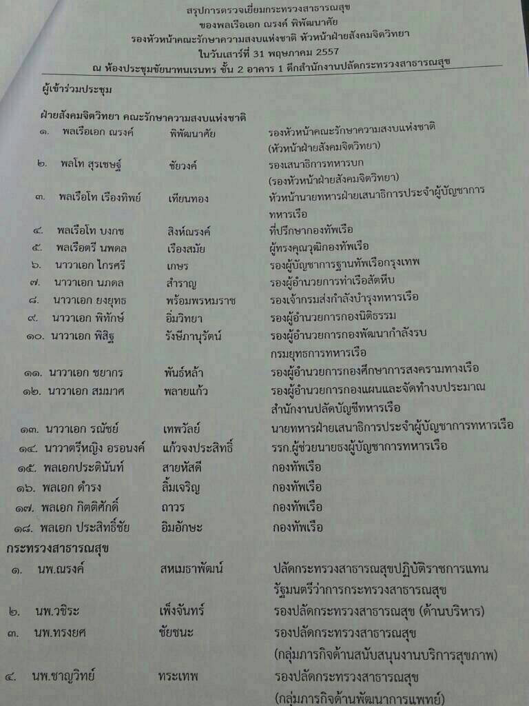 เป็นรายงานการประชุม เมื่อวันที่ 31 พ.ค.ที่ผ่านมา กับ พล.ร.อ.ณรงค์ พิพัฒนาศัย รองหัวหน้า คสช. ด้านสังคมจิตวิทยา และ คณะ ในการเข้าตรวจเยี่ยมกระทรวงสาธารณสุข