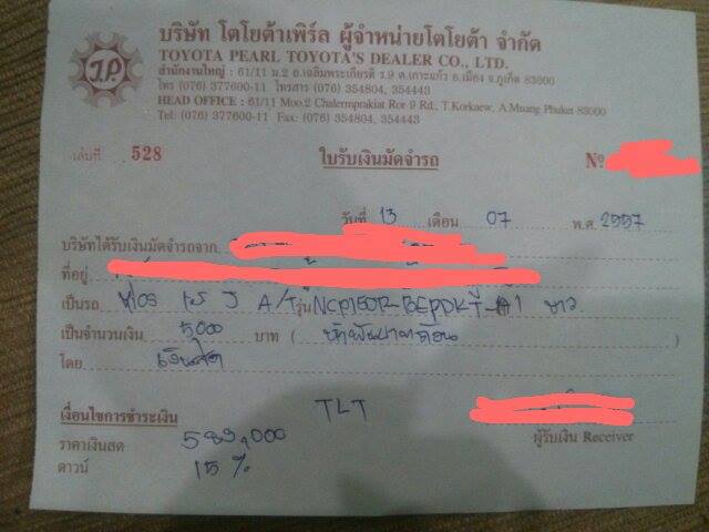 แต่พอกลับมาถึงบ้านเอาใบจองมานั่งดู มันเหมือนเป็นใบเสร็จรับเงินเลยอ่ะค่ะ ไม่มีรายละเอียดของแถม วันรับรถอะไรเลย แต่พวกรายละเอียดของแถม เซลเขียนแยกในกระดาษเอสี่เปล่าๆ (หรือของโตโยต้าเป็นแบบนี้ทุกที่อยู่แล้ว เราไม่ทราบอ่ะค่ะ)