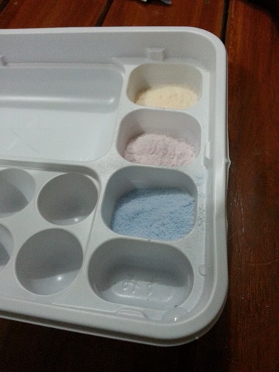 อย่างแรกก็เทสีใส่ลงไป ตอนแรกนึกว่าสีจะสดกว่านี้ แล้วก็ใส่น้ำอย่างละช้อน