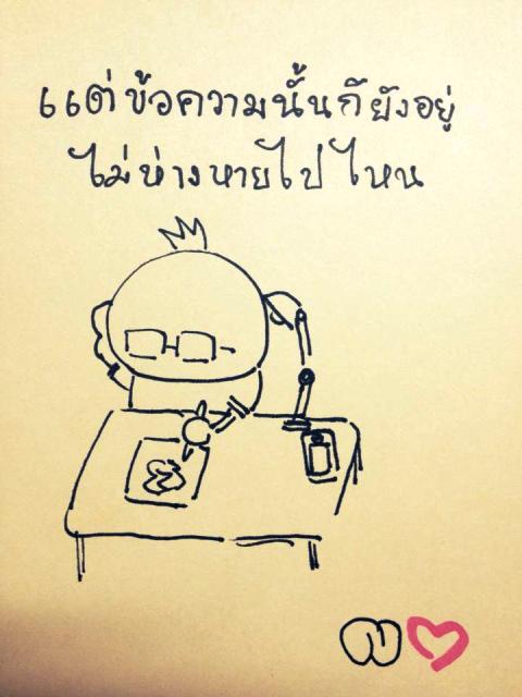 เขามองหน้าผม แล้วยิ้ม มันเป็นยิ้มที่ทั้งสุขเบาๆ และเหงาลึกๆ "เราไม่ได้ต้องการให้เขาตอบ หรืออ่านข้อความอะไรของเราทั้งนั้น เราแค่ส่งไป เพื่อให้รู้ว่าเรายังอยู่ตรงนี้...ยังอยู่ที่เดิม...ที่ที่วันไหนเธอหันกลับมาเธอก็จะเจอเราเสมอ"