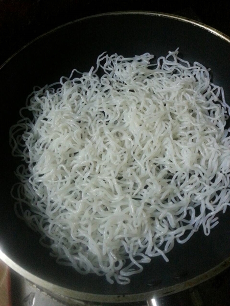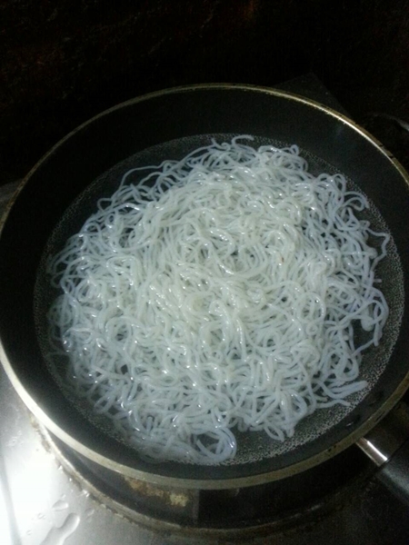 กระทะตั้งไฟ ลวกเส้นบุกก่อนครับ ประมาณ 2 - 3 นาที