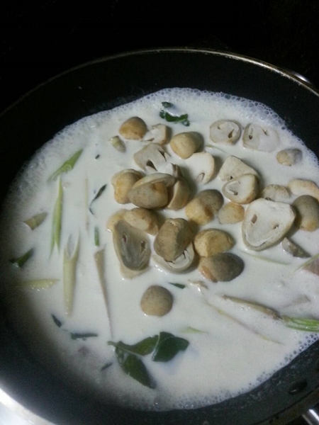 พอกลิ่มสมุนไพรเราเริ่มหอมก็ใส่เห็ดฟางตามลงไปครับ