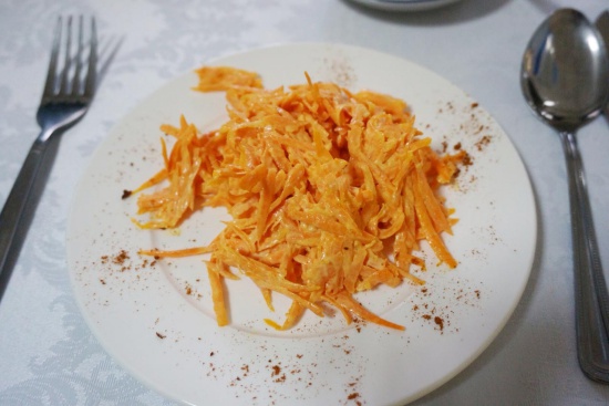 ถัดมาจานแรกที่เสริฟก็จะเป็นสลัดแครอท ก็จะมีน้ำสลัดให้มากรุบกริบโรยด้วยผงพริกอะไรสักอย่าง รสชาติก็งั้นๆนะจ้ะ อันที่สองคือซุปของรัสเซีย จำไม่ได้ว่าเรียกว่าอะไร แต่เค้าบอกว่าต้องใส่ซาวครีมเข้าไปเพื่อเพิ่มความอร่อย