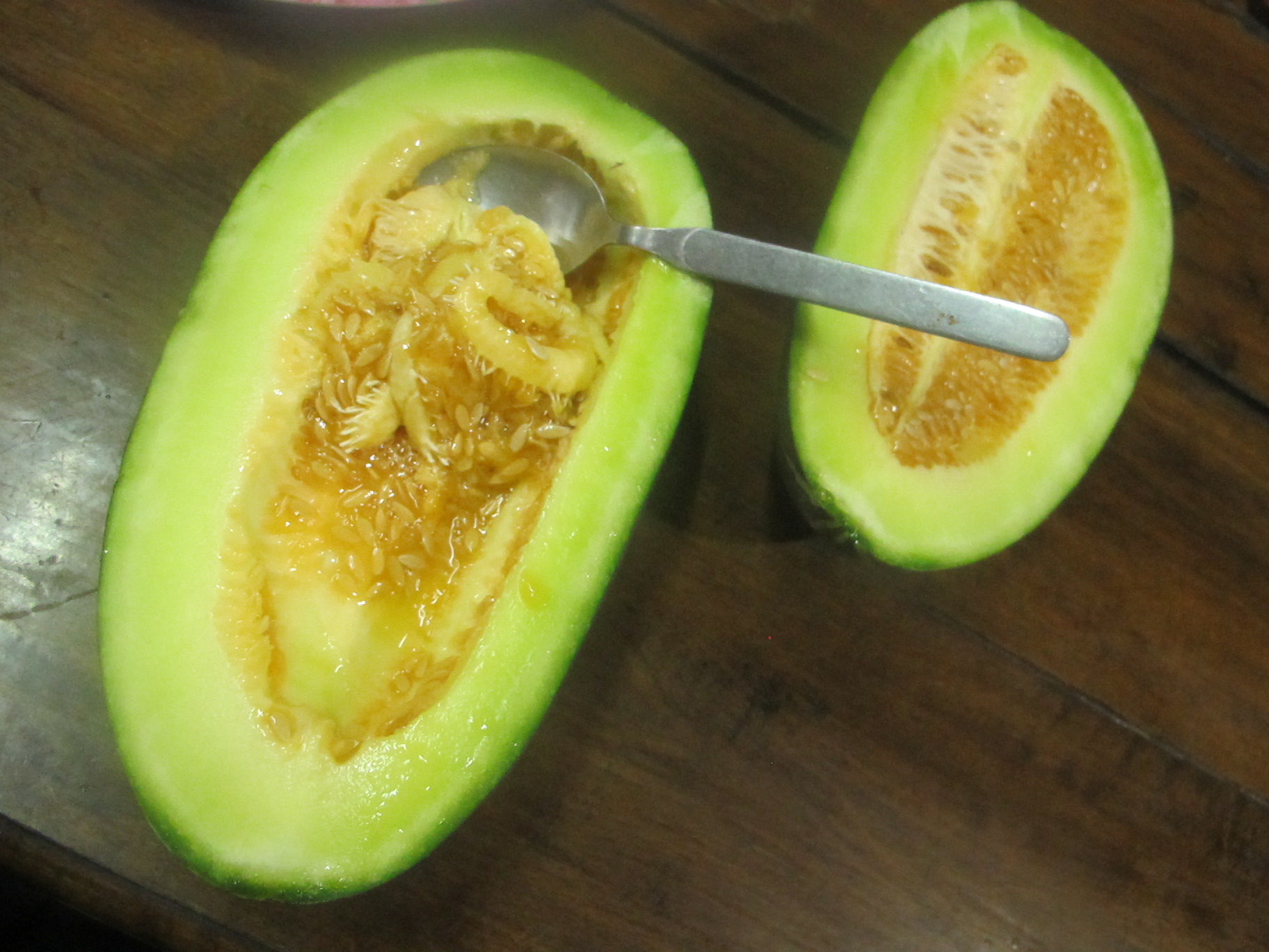 5.แตงไทย 850 กรัม เลือกที่แก่กำลังดีจะนิ่มรับประทานง่าย(ถ้าแก่กำลังดีใส้ในจะสีออกเหลืองเขียวนะคะ อันที่แป๋มมีมันไม่แก่เท่าใหร่ แต่ก้ไม่ได้แข็งจนเกินไป สีเลยเขียวไปหน่อย)