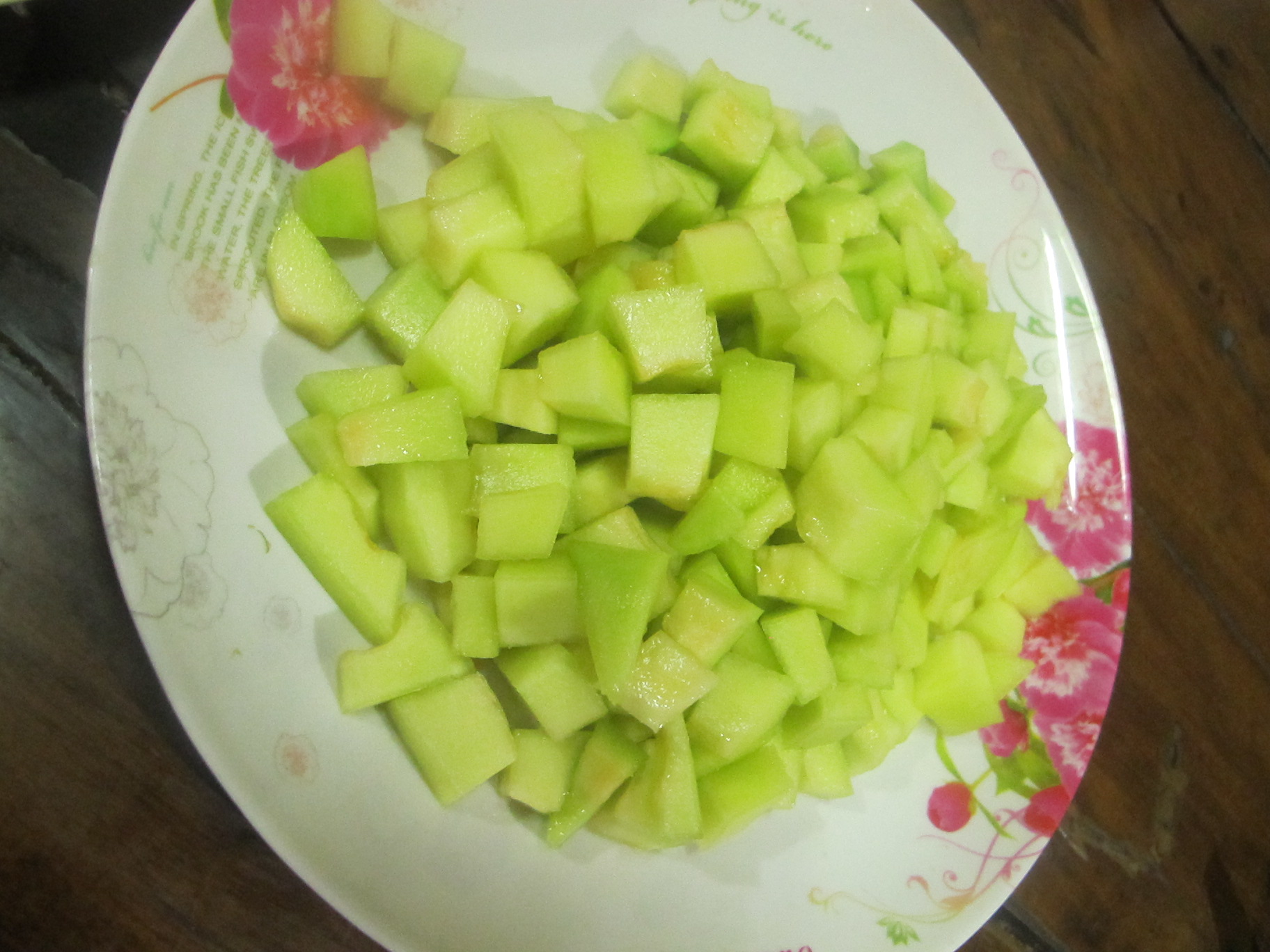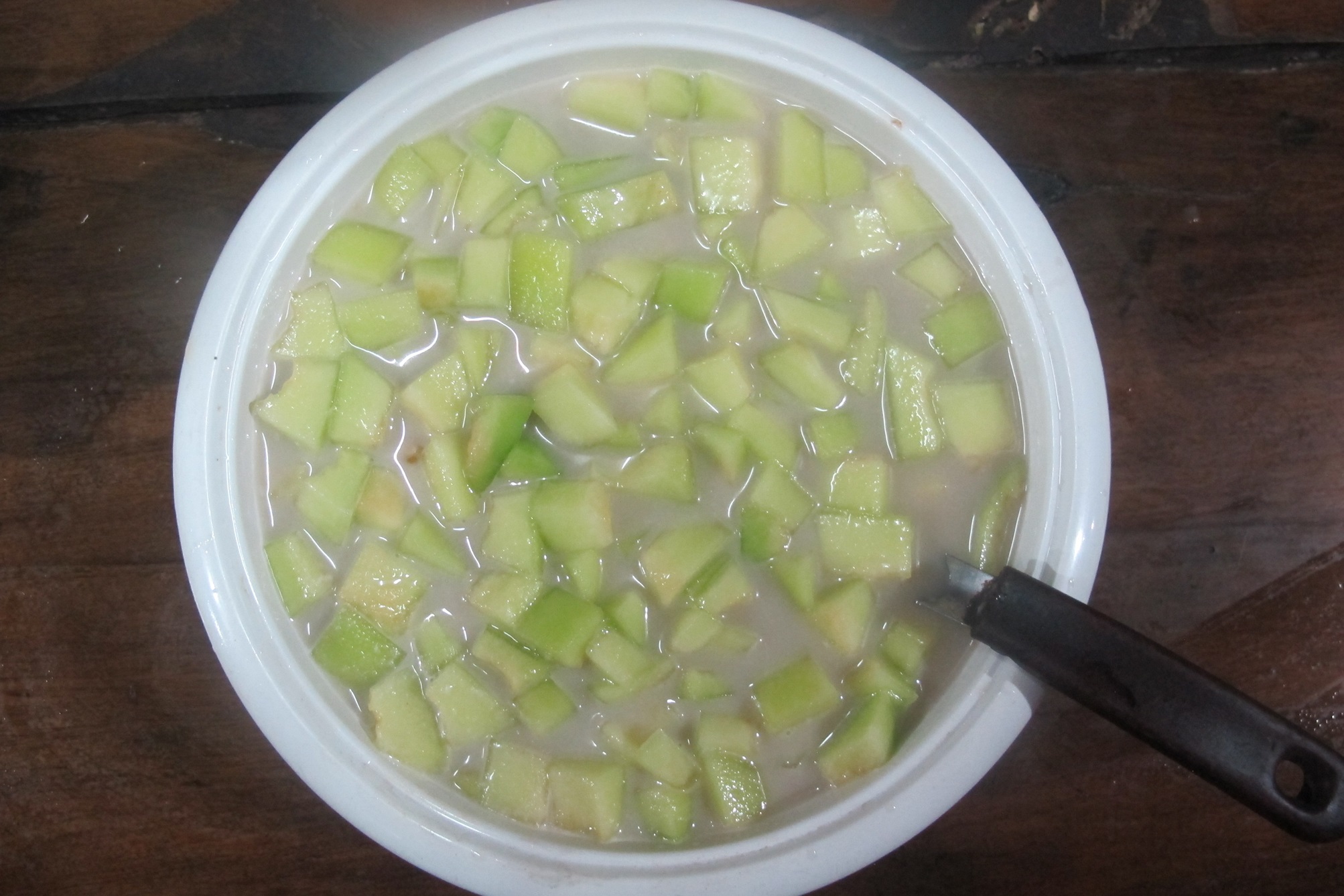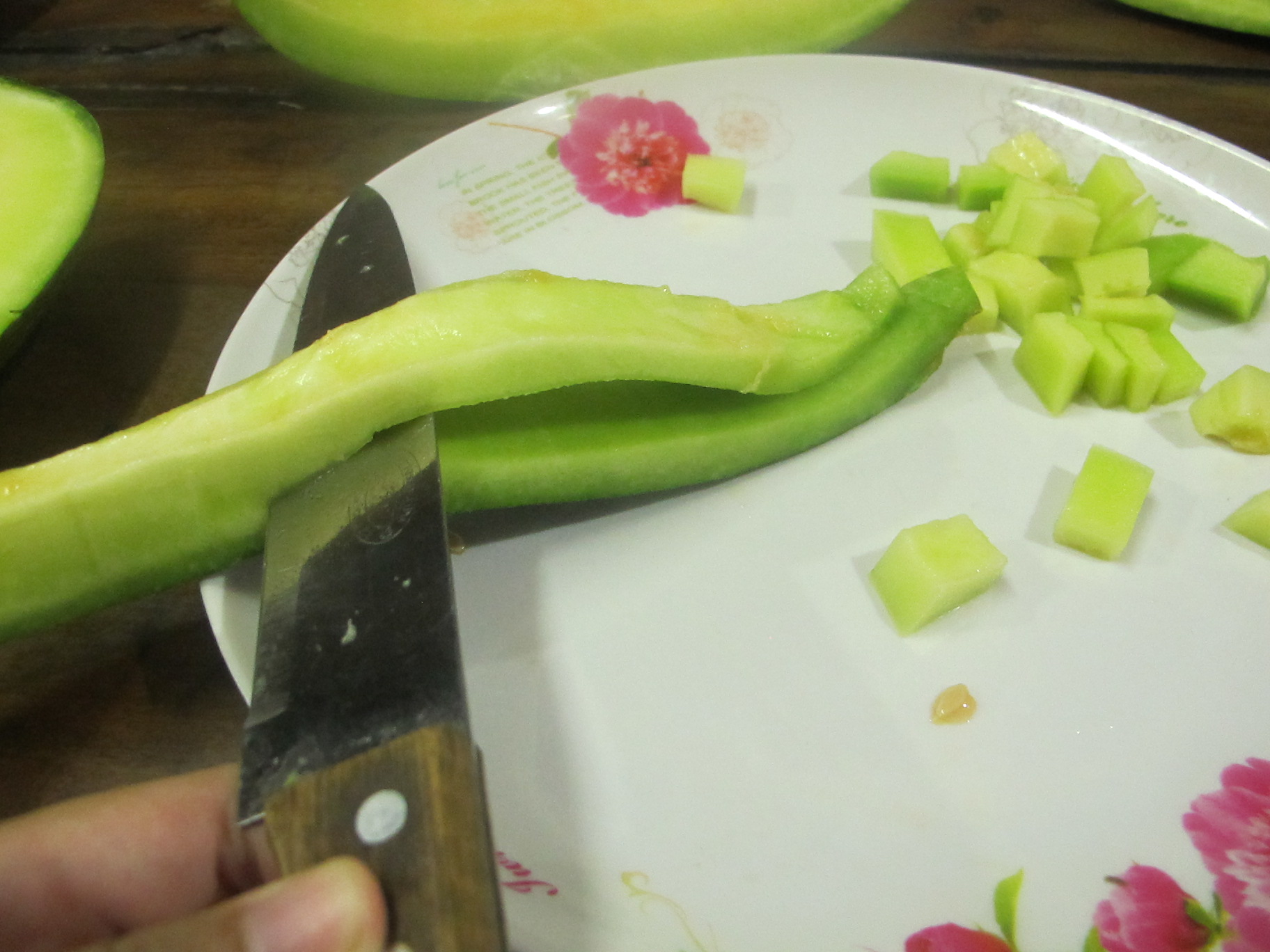 เสร็จแล้วหั่นเป็นชิ้นพอคำ ไม่ต้องคว้านลึกไปถึงสีเขียวเข้มๆที่ใกล้เปลือกนะคะ มันแข็งไป