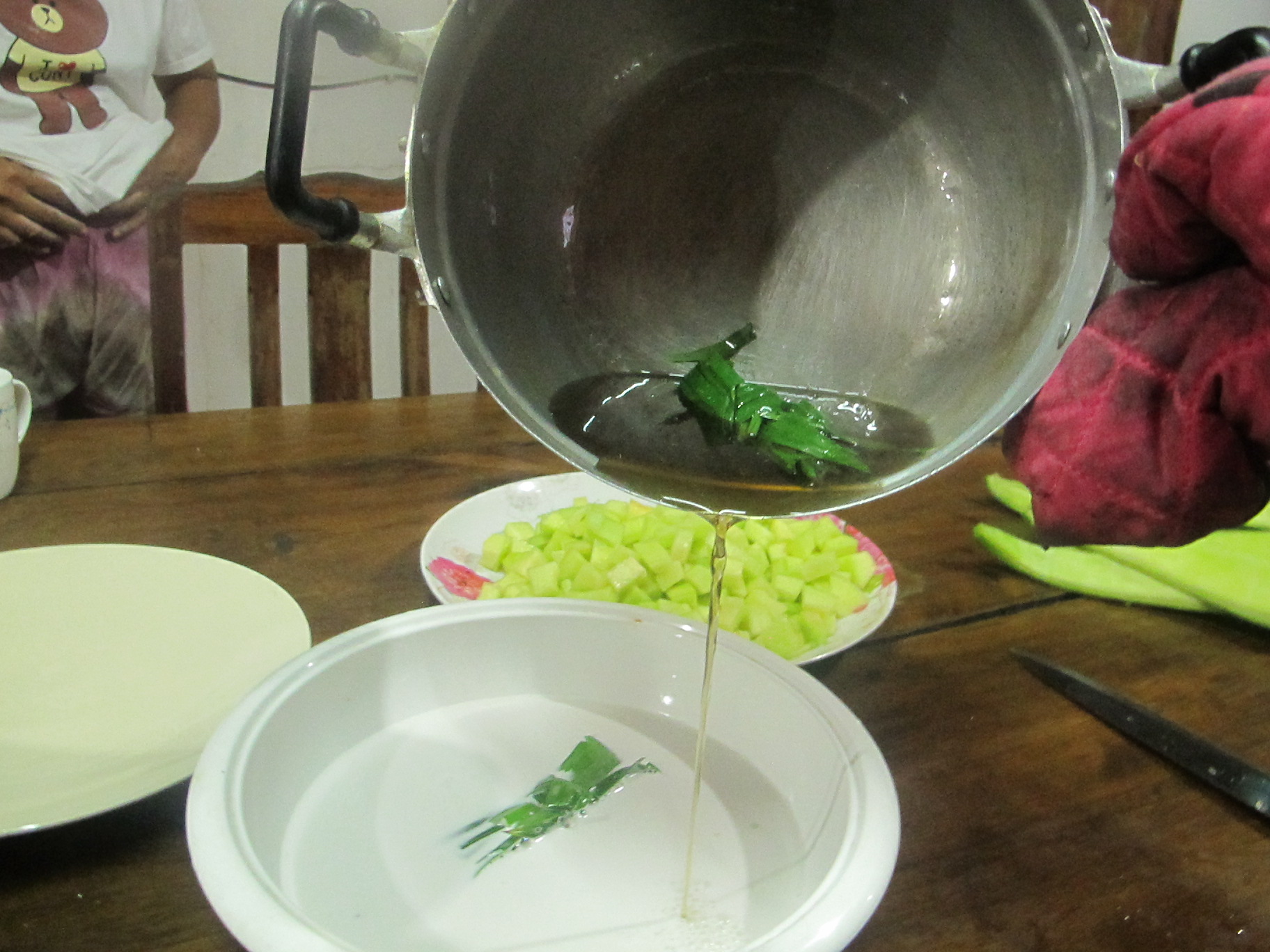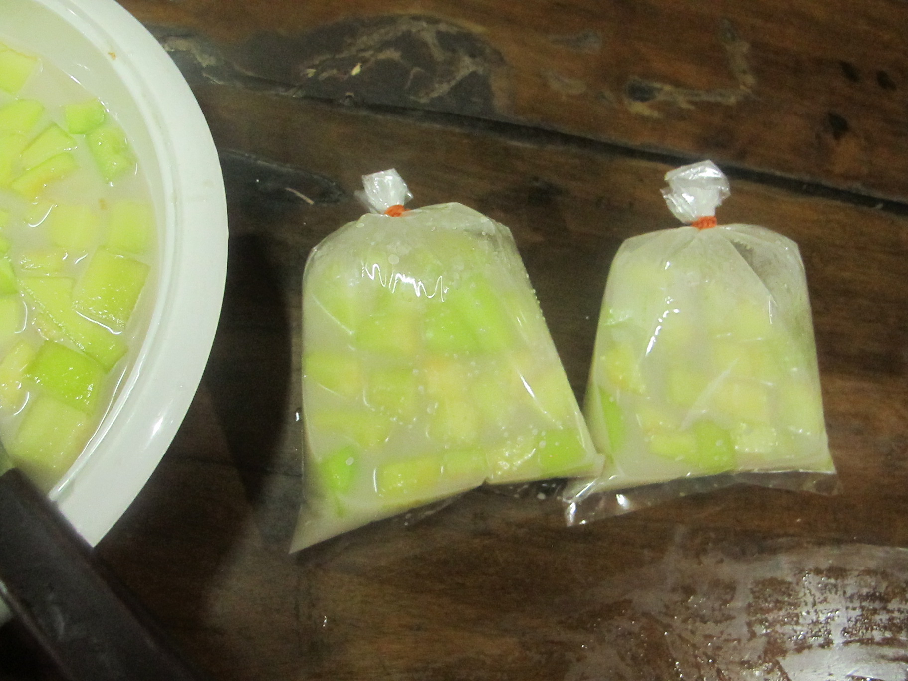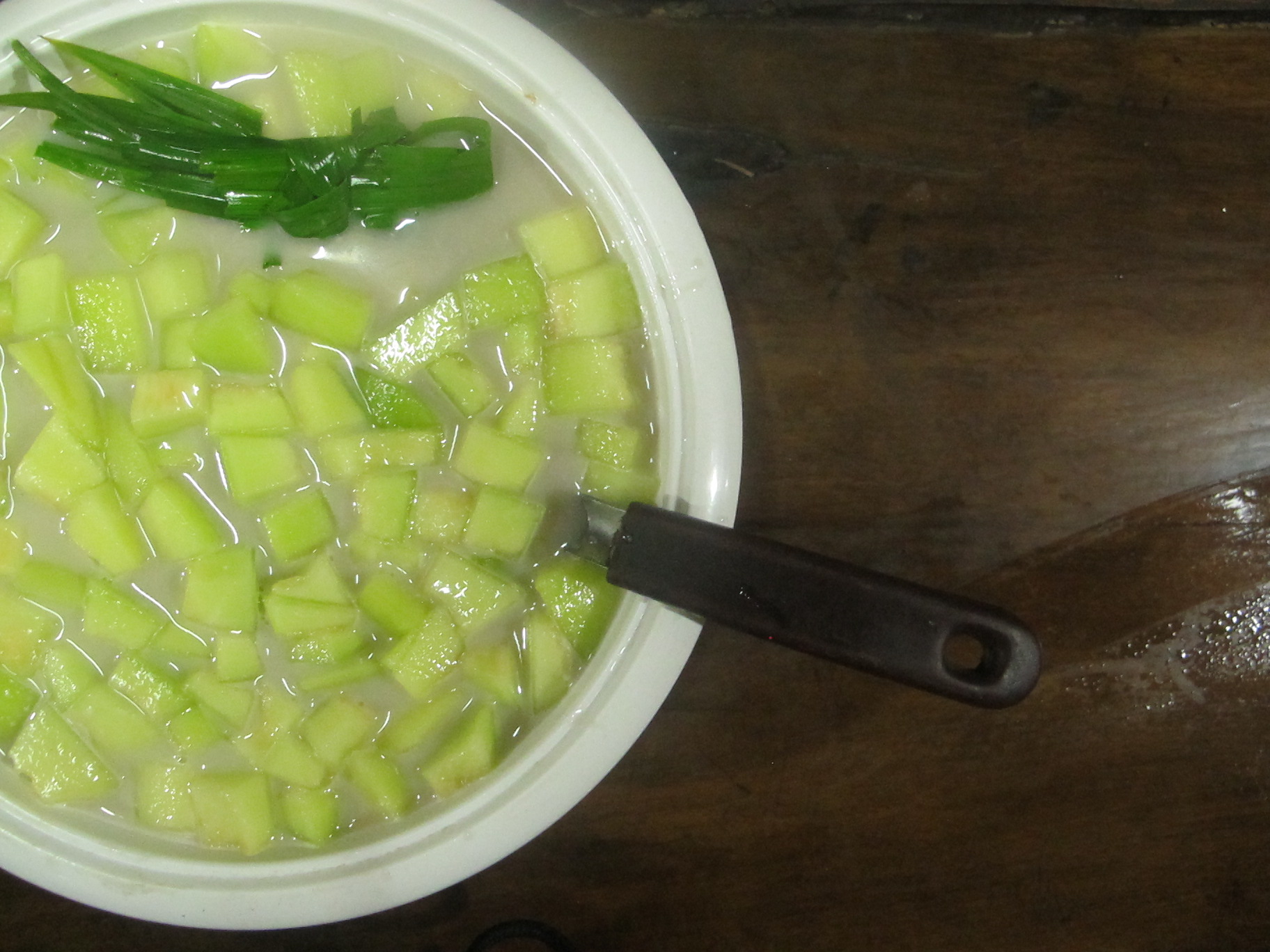 เสร็จแล้วหั่นเป็นชิ้นพอคำ ไม่ต้องคว้านลึกไปถึงสีเขียวเข้มๆที่ใกล้เปลือกนะคะ มันแข็งไป