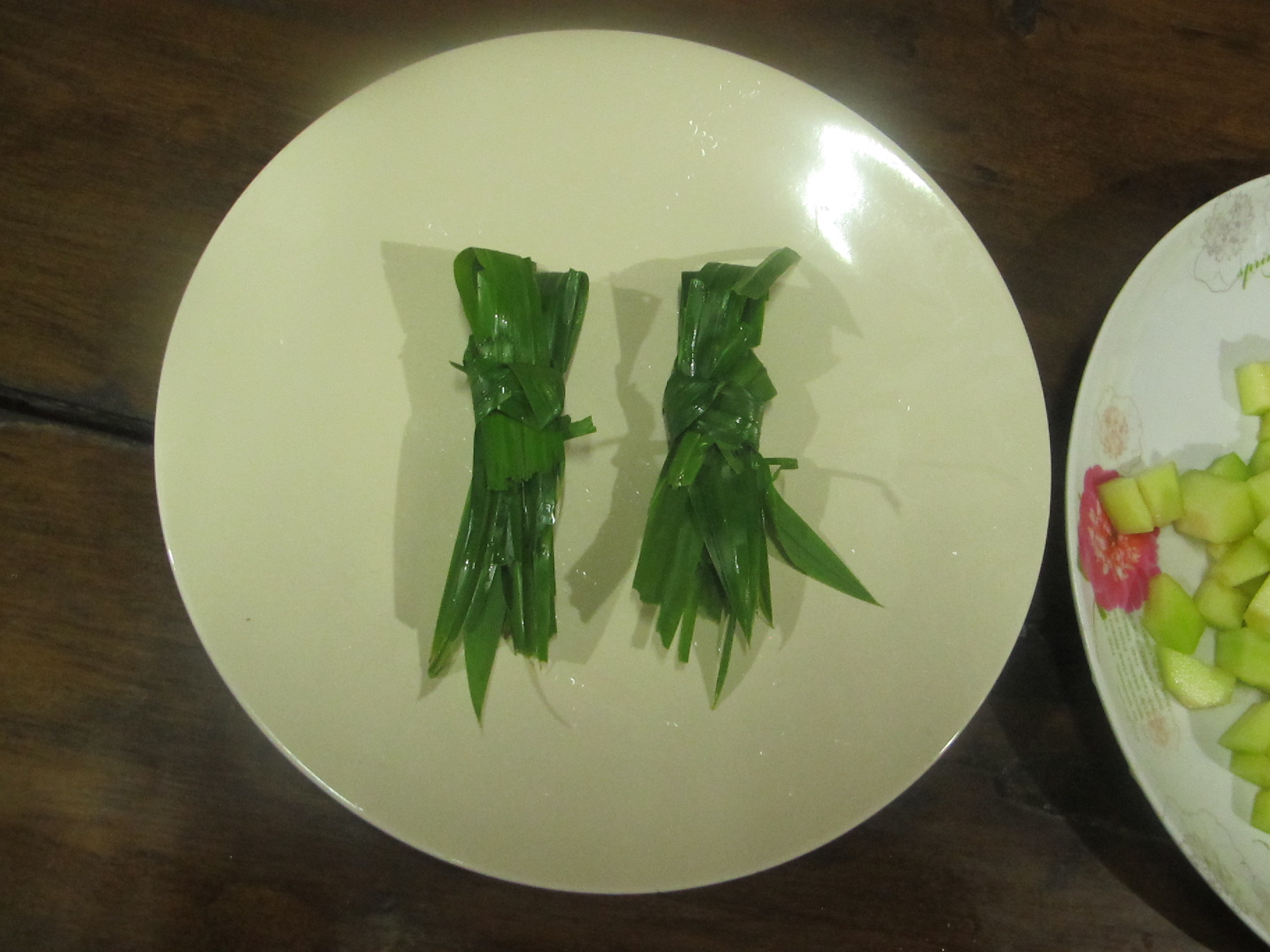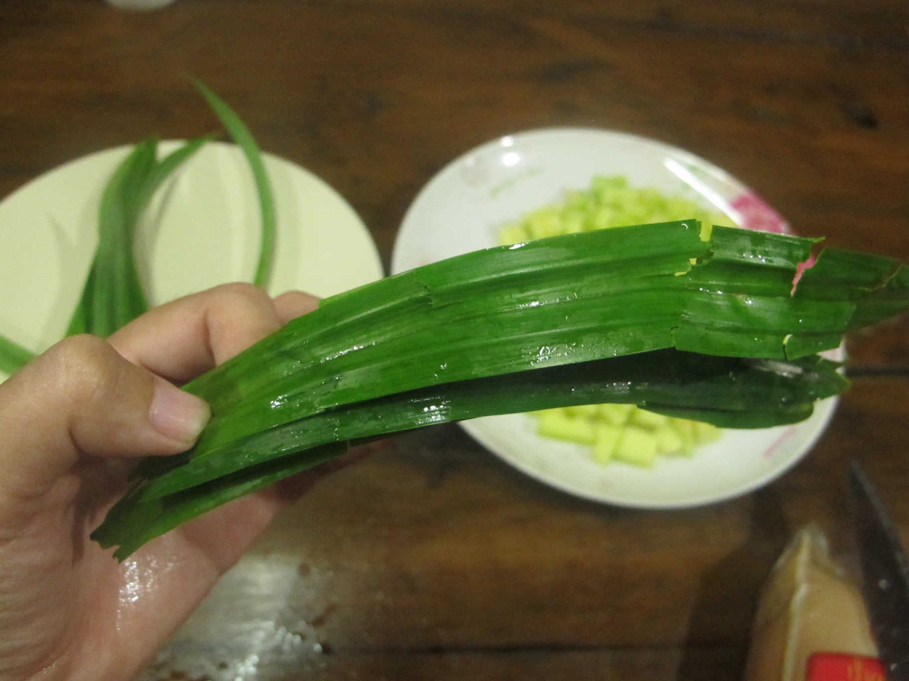 ฉีกใบเตยนะคะ ให้ทั่วๆใบเลย กลิ่นจะได้หอมๆ เสร็จแล้วมัดไว้สองอันค่ะ อันนึงใส่น้ำเชื่อม อันนึงใส่น้ำกระทิ