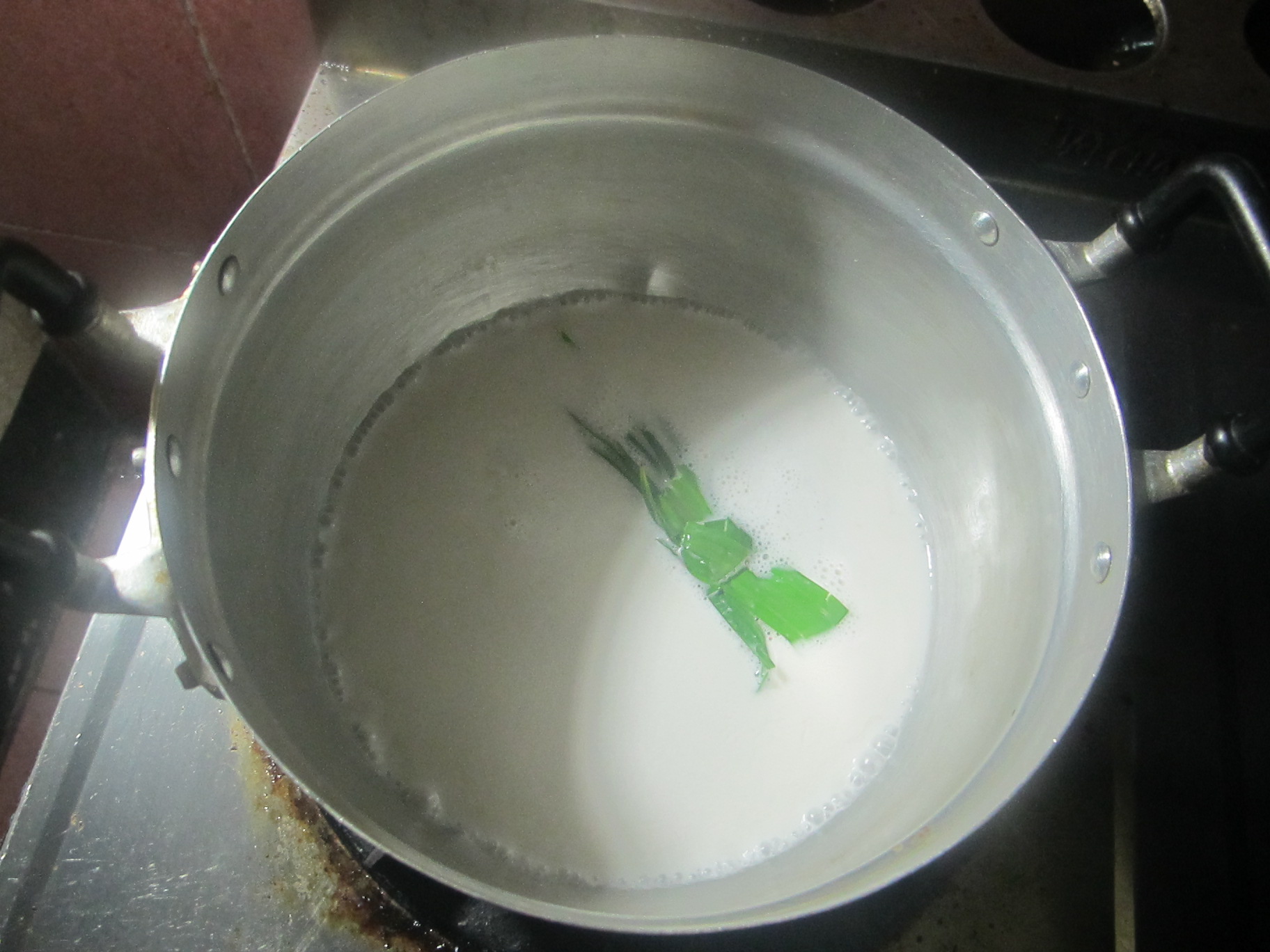 น้ำกระทิไปต้มนะคะ 1 นาทีก้พอค่ะ (เราเอาแค่พอกะทิหอมและมีกลิ่นใบเตย ไม่ต้องถึงกับกระทิแตกมัน )ไฟแรงสุดเลย พอเดือดปุดๆแค่ที่ขอบหม้อ เริ่มมีกลิ่นหอมของกระทิเป็นใช้ใด้ ปิสแกสเลยคร้าายกลงจากเตา